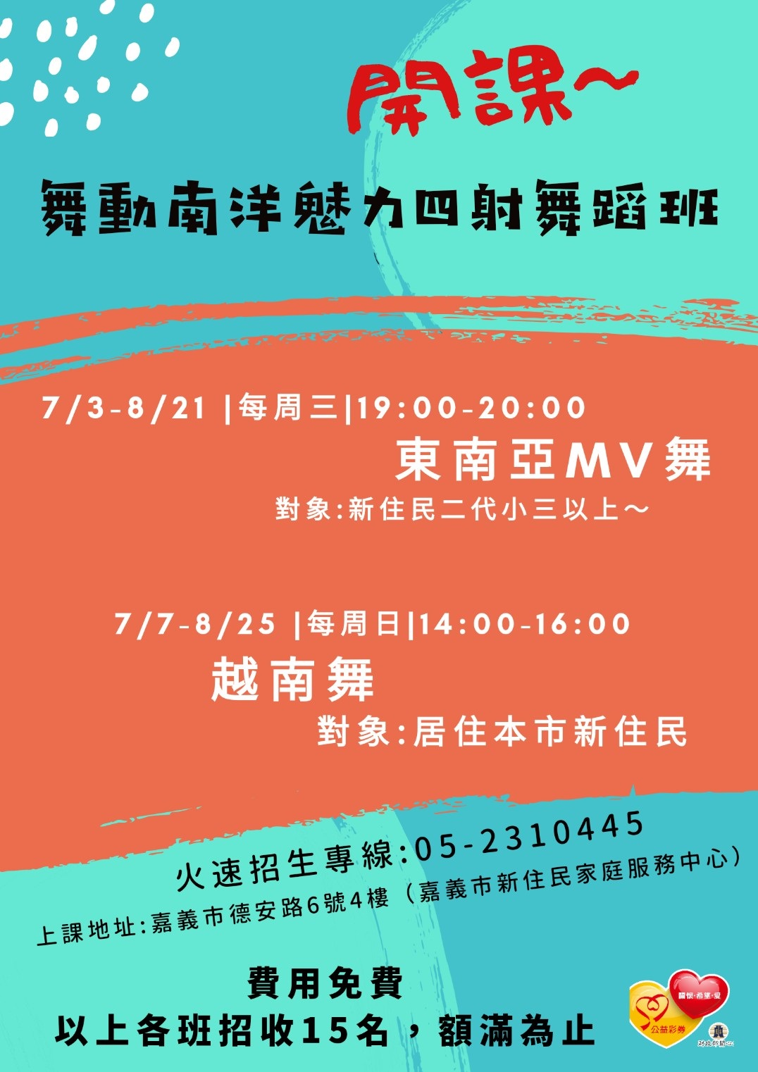 (一)7月3日~8月21日(每週三)19:00~20:00東南亞mv舞,參與對象為居住本市新住民之就讀國小三年級以上子女。