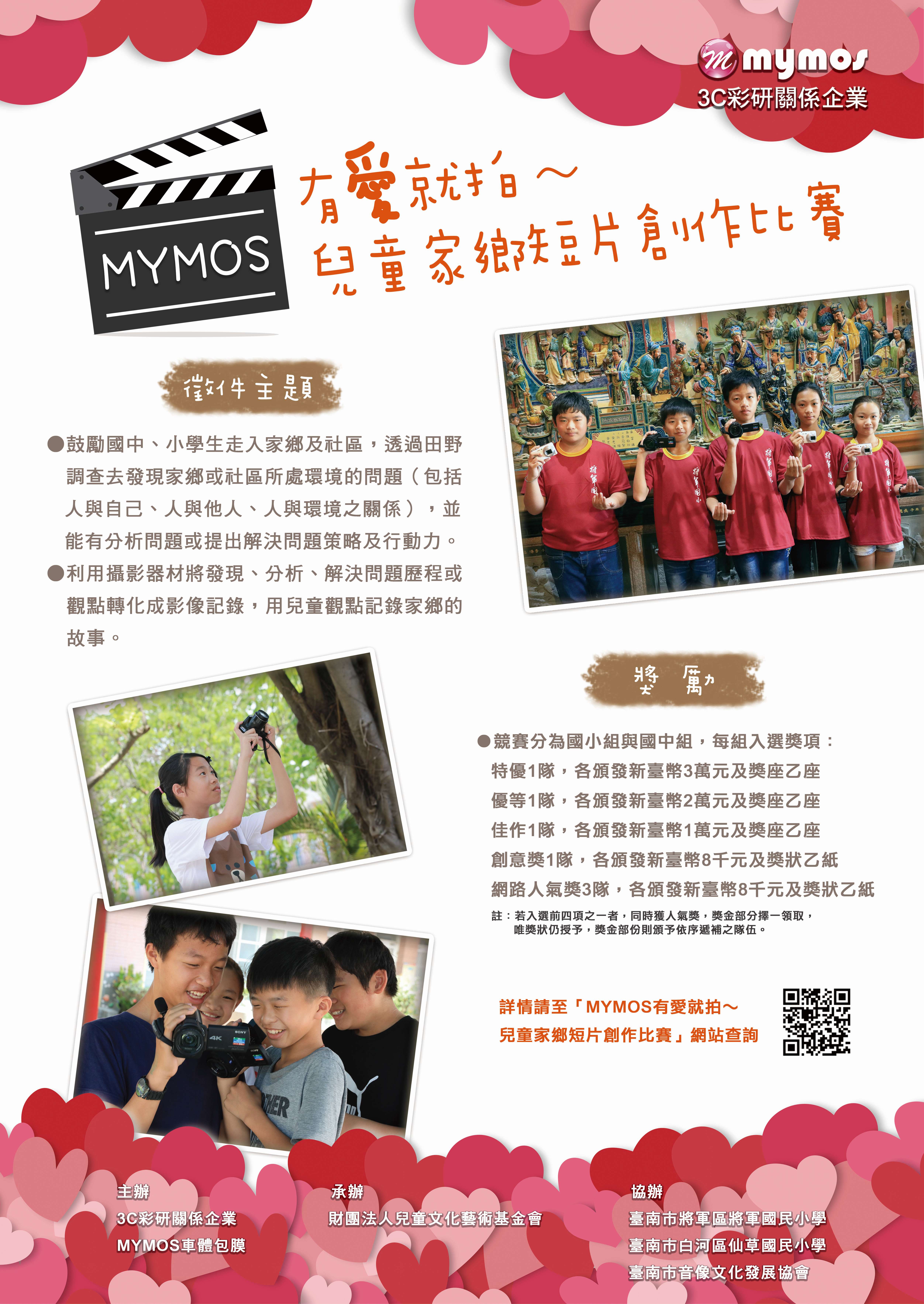 一、由MYMOS企業集團贊助本會辦理「MYMOS有愛就拍~兒童家鄉短片創作比賽」活動辦法說明如下: 1.MYMOS企業集團長期致力於社會公益服務,期盼藉由辦理本次活動,鼓勵國中、小學生走入家鄉及社區,透過田野調查去觀察及發現家鄉或社區所處環境的問題(包括人與自己、人與他人、人與環境之關係),並能有分析問題或提出解決問題策略及行動力。利用攝影器材將觀點及歷程轉化成影像記錄,用兒童觀點說家鄉的故事,藉由本活動鼓勵優秀小導演及創作團隊持續發現社會中良善的力量,並為社會公益盡一己之力。 2.參與對象:國中、小在籍之學生。 3.活動網址及簡章下載請至: https://mymoslove.weebly.com/