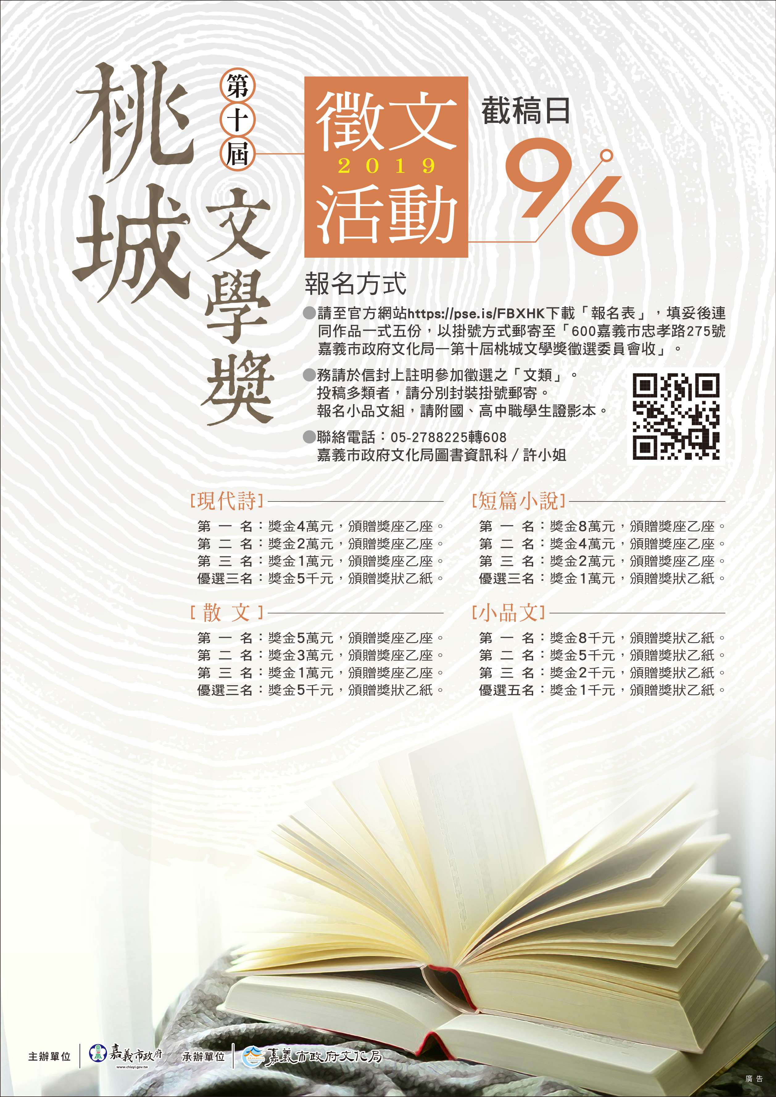 二、徵選類別分為散文、現代詩、短篇小說、小品文等四類,除了「小品文」類限定國、高中職生參加,其餘各文類不限條件,每人各文類以投稿一篇為限。