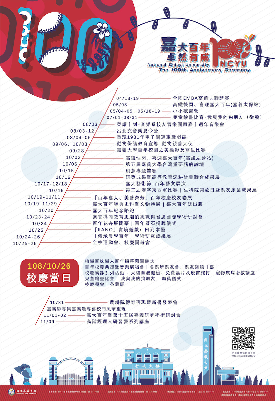 嘉義大學訂於108年10月26日(星期六)在蘭潭校區瑞穗館辦理「創校100週年校慶典禮暨相關慶祝活動」,請廣為宣傳,鼓勵師生參加共襄盛舉。