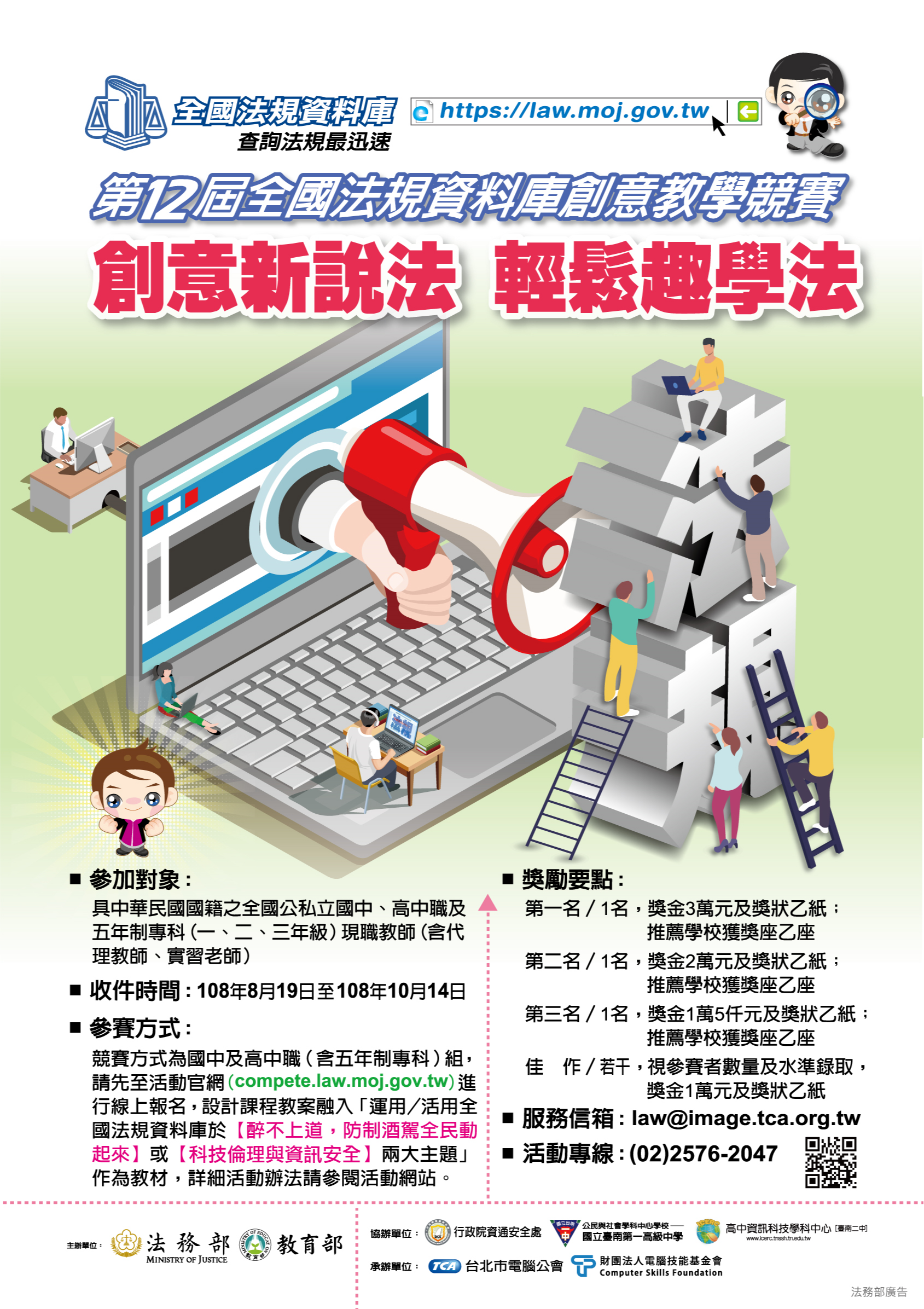 (二)全國法規資料庫創意教學競賽:參加對象為年級全國國中、高中職及五年制專科學校教師。以「醉不上道,防治酒駕全民動起來」或「科技倫理與資訊安全」兩大議題為創作主題,設計以全國法規資料庫為教學平台之創新教案。收件期間:108年8月19日至108年10月14日止。