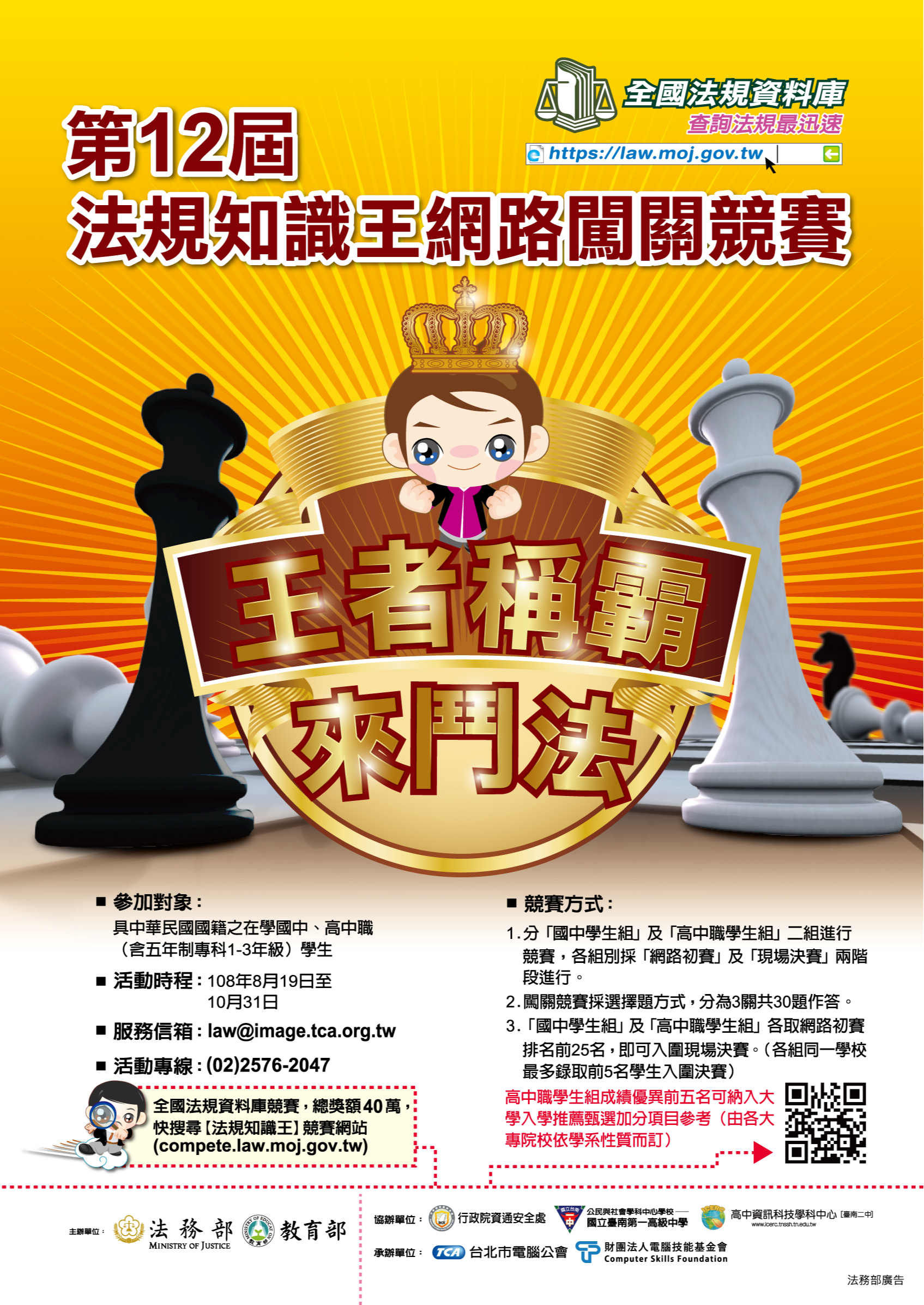 (一)全國法規資料庫法規知識王網路闖關競賽:參加對象為年級全國國中、高中職(含五年制專科學校一、二、三),採分組競賽方式。競賽以生活常見法律實例,採選擇題方式進行網路闖關。活動期間:自108年8月19日至10月31日止。