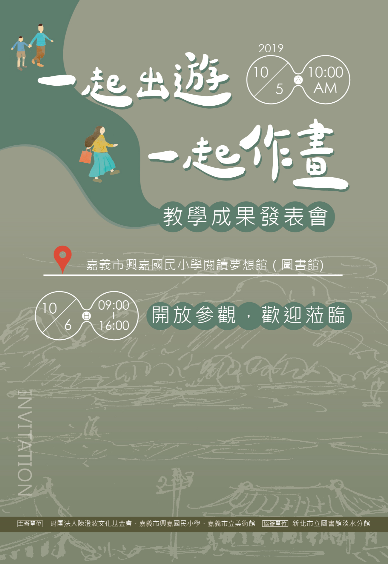 一、「一起出遊,一起作畫」教育推廣計畫訂於108年10月5日(六)上午10時於嘉義市興嘉國民小學閱讀夢想館(圖書館)辦理教學成果發表會,並於10月6日(日)上午9時-16時開放參觀。