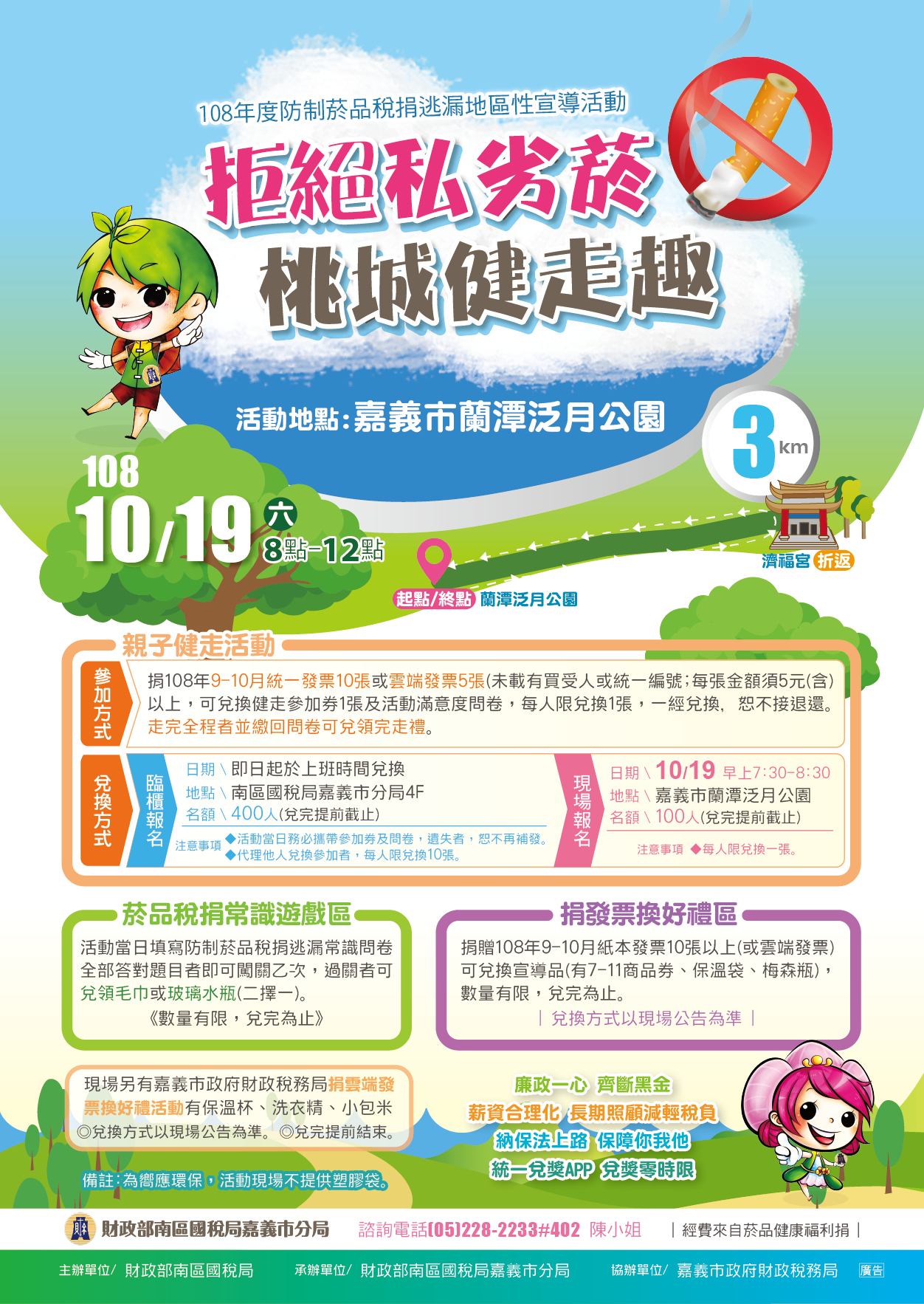活動網址:財政部南區國稅局網站https://www.ntbsa.gov.tw/etwmain/宣導活動/嘉義市分局108年度防制菸品稅捐逃漏地區性宣導活動「拒絕私劣菸 桃城健走趣」。