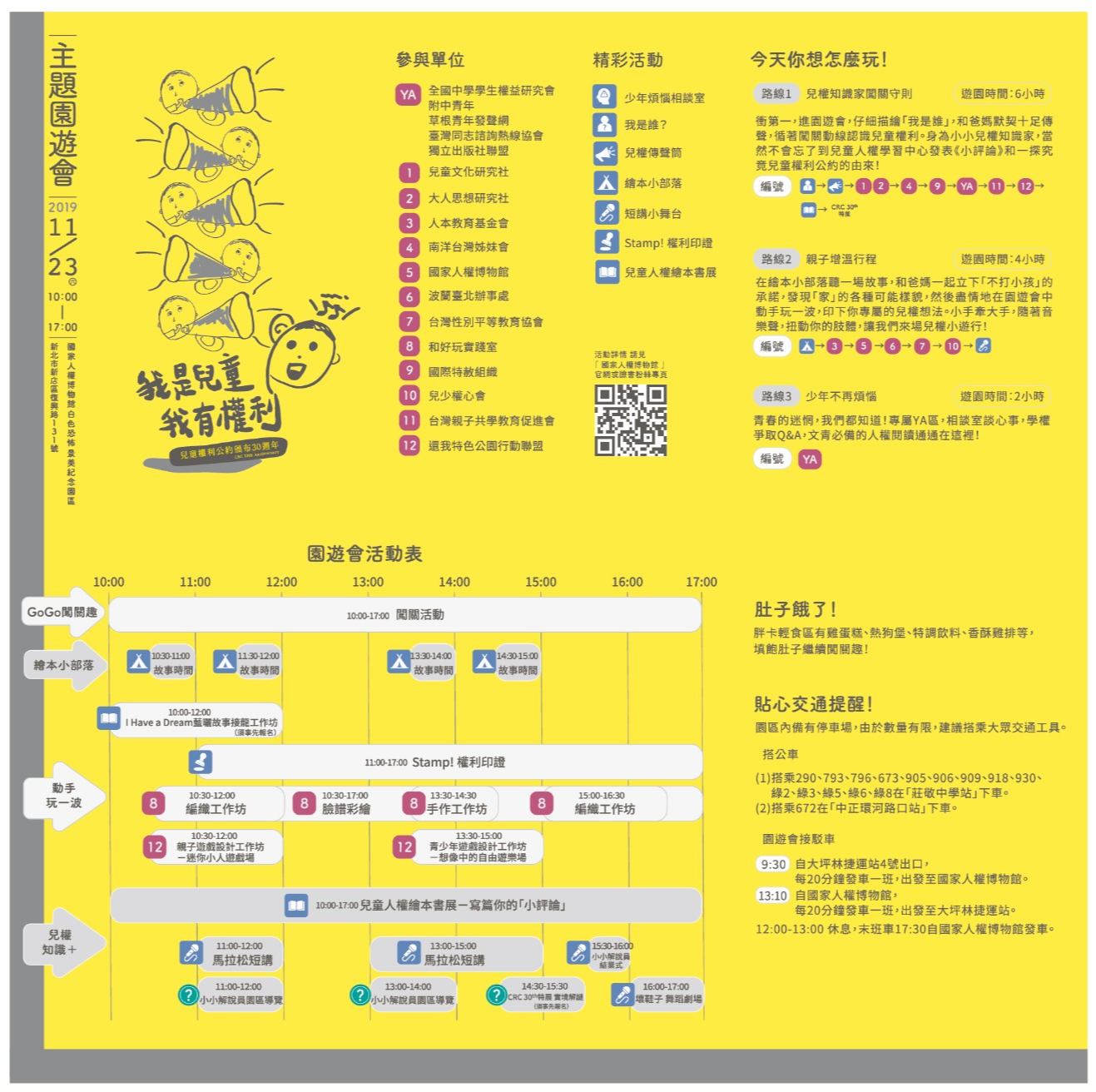 (三)活動內容:邀請臺灣在地關注兒少人權議題的非營利組織共同參與,藉由藝術裝置、闖關遊戲、繪本故事、手作工作坊、兒權市集、以及結合主題特展展場導覽的實境解謎遊戲等豐富有趣的活動,讓兒童、父母皆可從遊戲中進一步認識兒童權利,歡迎各界蒞臨參與。