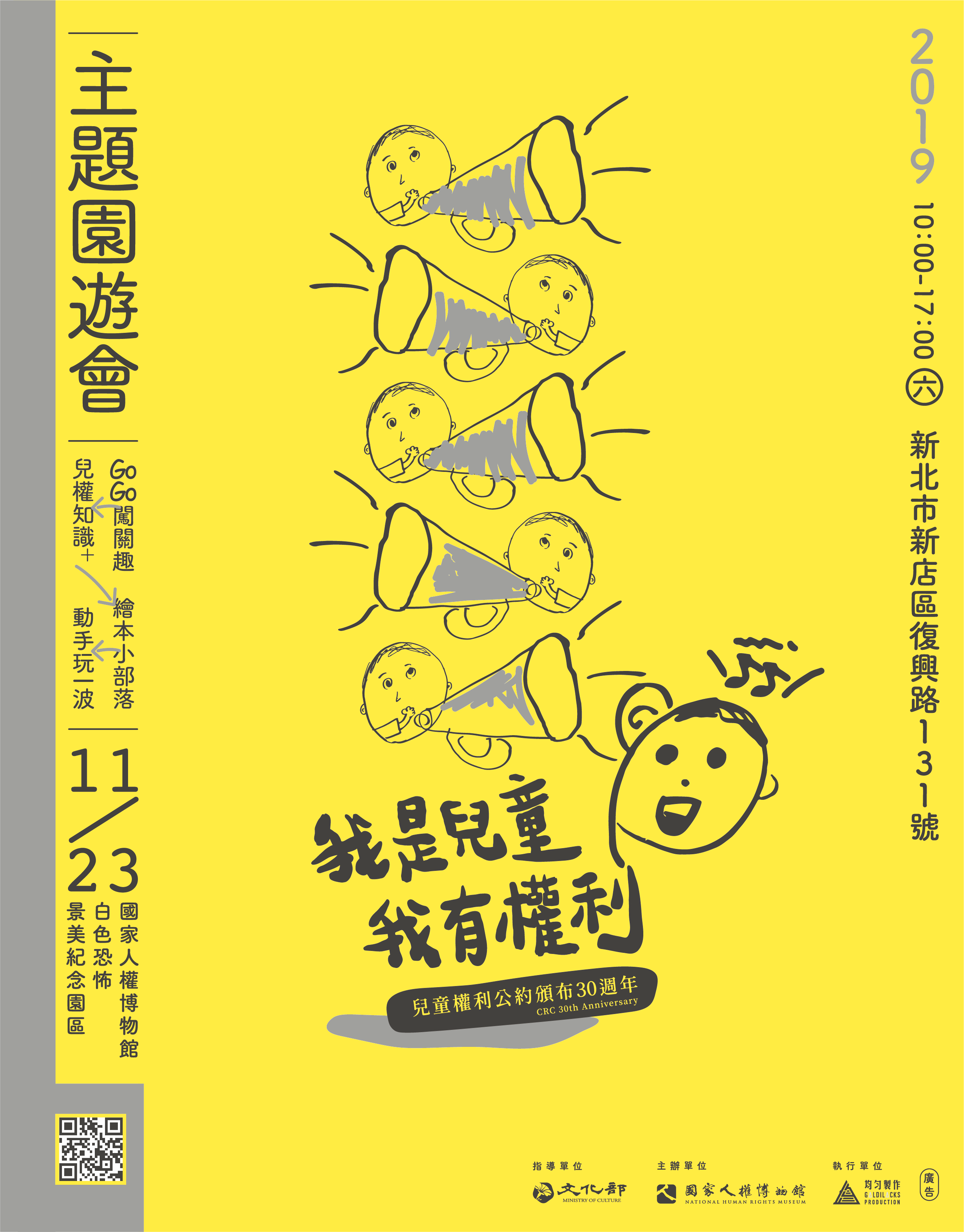 (三)活動內容:邀請臺灣在地關注兒少人權議題的非營利組織共同參與,藉由藝術裝置、闖關遊戲、繪本故事、手作工作坊、兒權市集、以及結合主題特展展場導覽的實境解謎遊戲等豐富有趣的活動,讓兒童、父母皆可從遊戲中進一步認識兒童權利,歡迎各界蒞臨參與。