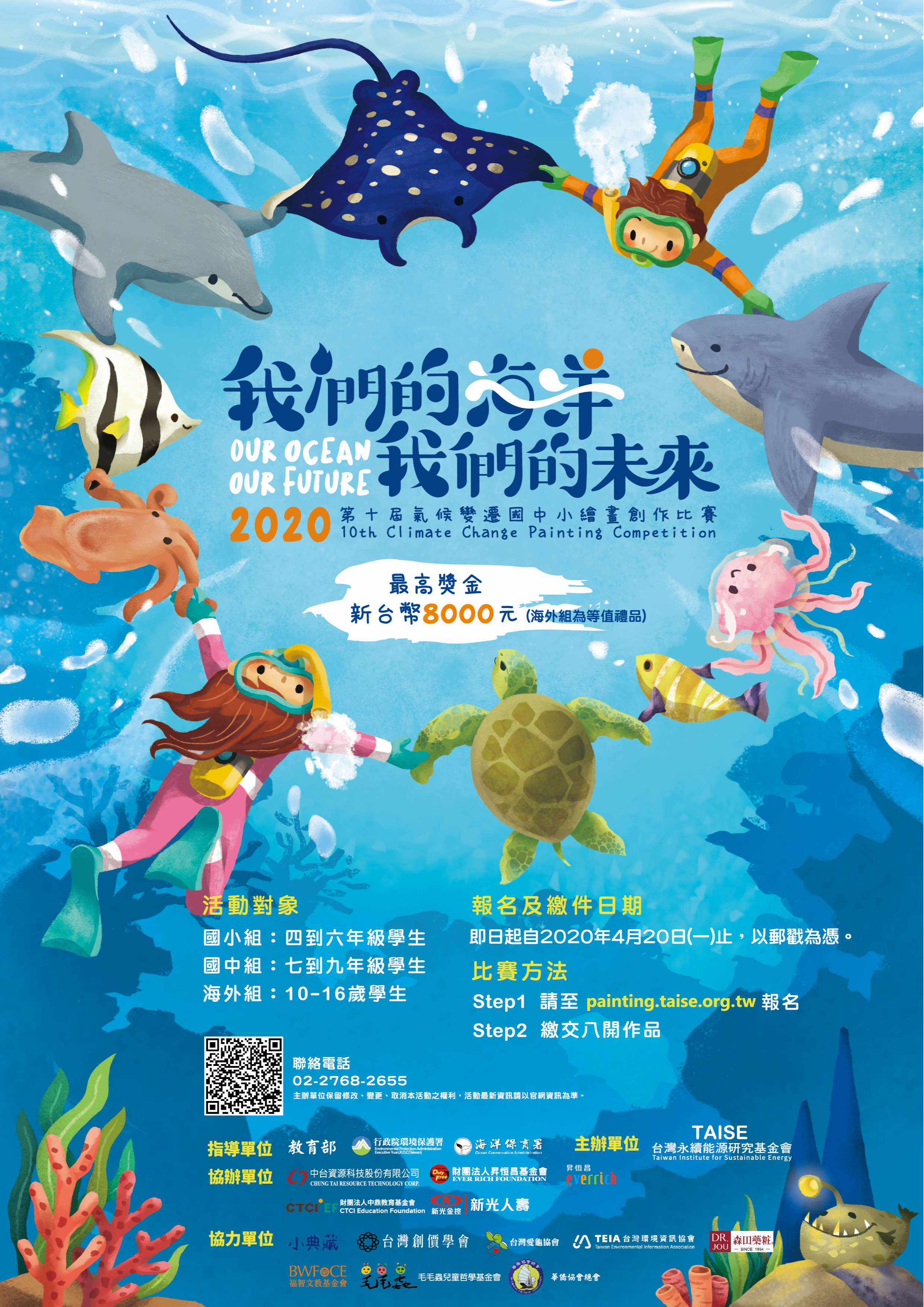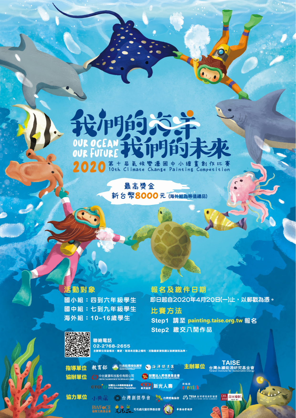 一、由教育部、環境保護署與海洋保育署共同指導,本會主辦之「2020年第十屆氣候變遷國中小繪畫創作比賽」,以「我們的海洋‧我們的未來」為主題,其活動報名與繳件日期自即日起至4月20日(一)止。