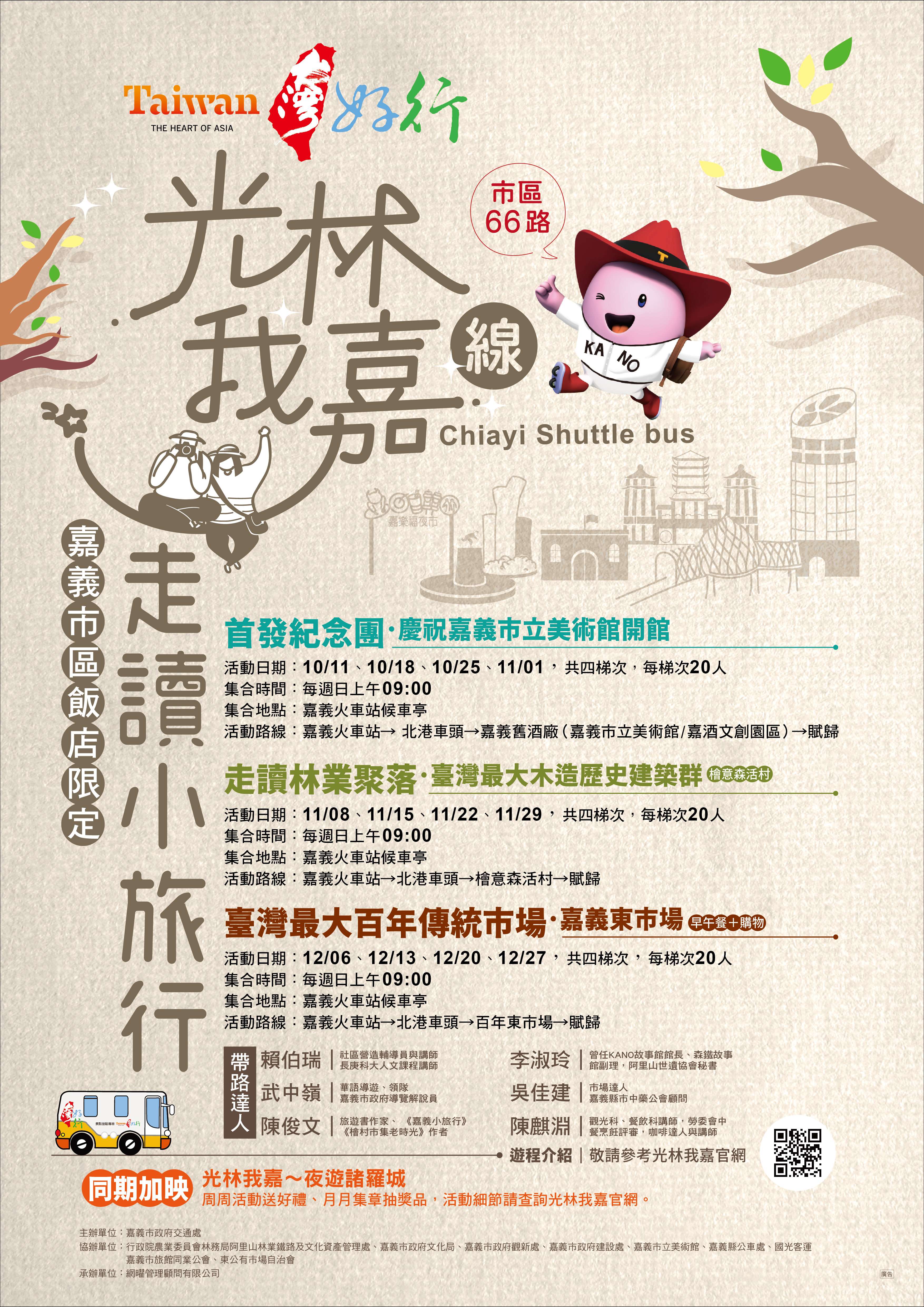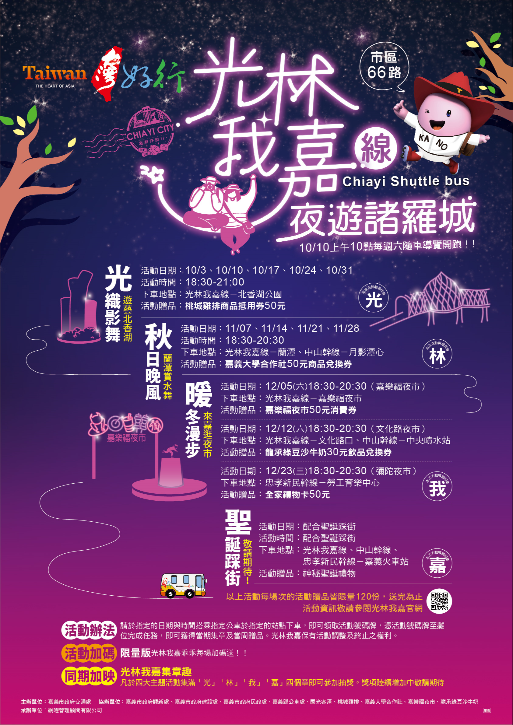 為加強本市市區公車搭乘體驗,鼓勵民眾多加利用市區公車,本處結合嘉義市市區主要觀光景點及活動規劃辦理「夜遊諸羅城」與「走讀小旅行」活動。