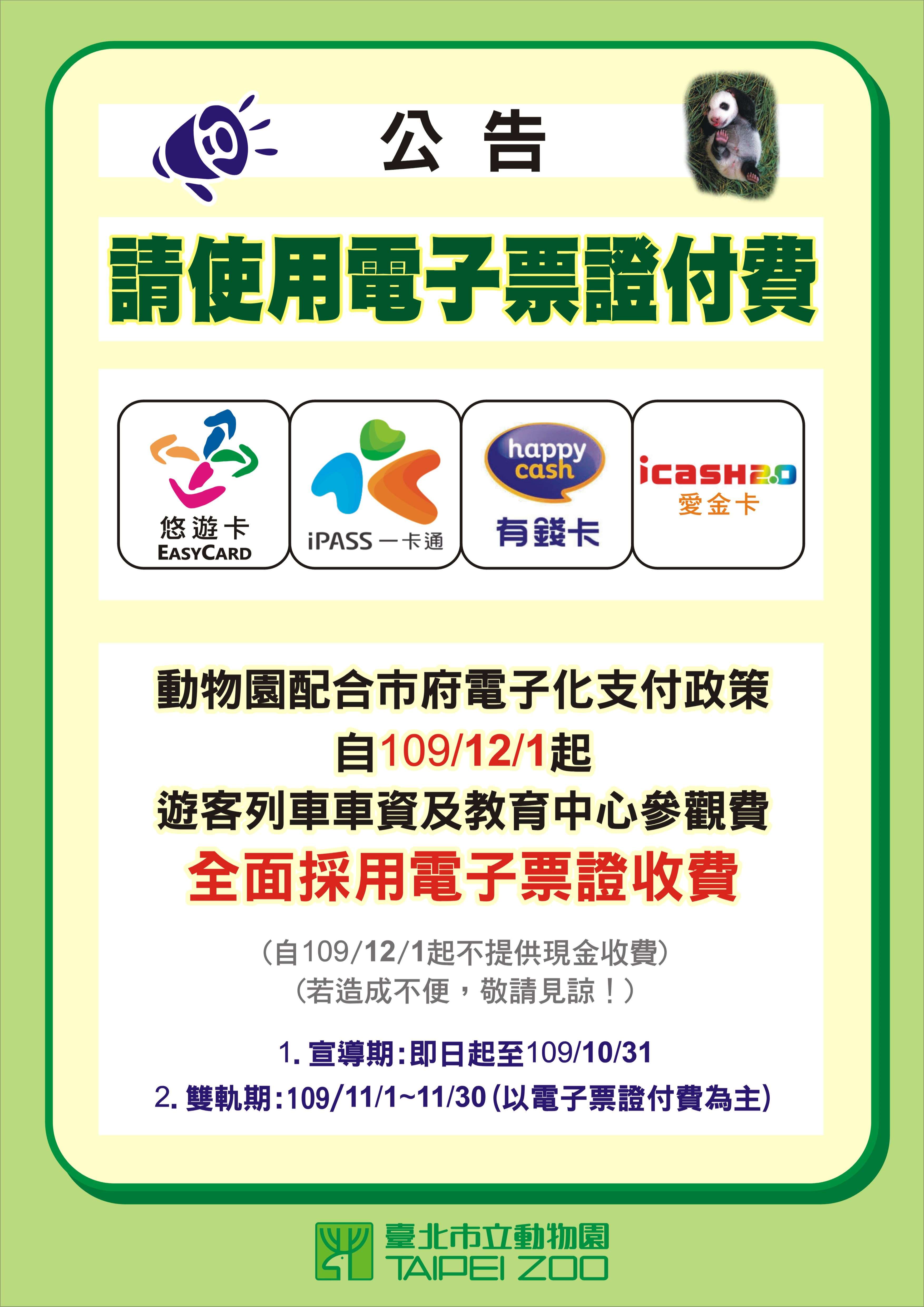 二、臺北市立動物園為配合市府電子化支付政策,遊客列車車資及教育中心參觀費,自109年12月1日起與現行遊客入園參觀費收取模式一致,全面採用「電子票證」付費方式,將不再提供遊客以現金付費服務;預定於109年11月1至30日期間為宣導期,仍得採用電子票證與現金雙軌付費方式(以電子票證付費為主)。