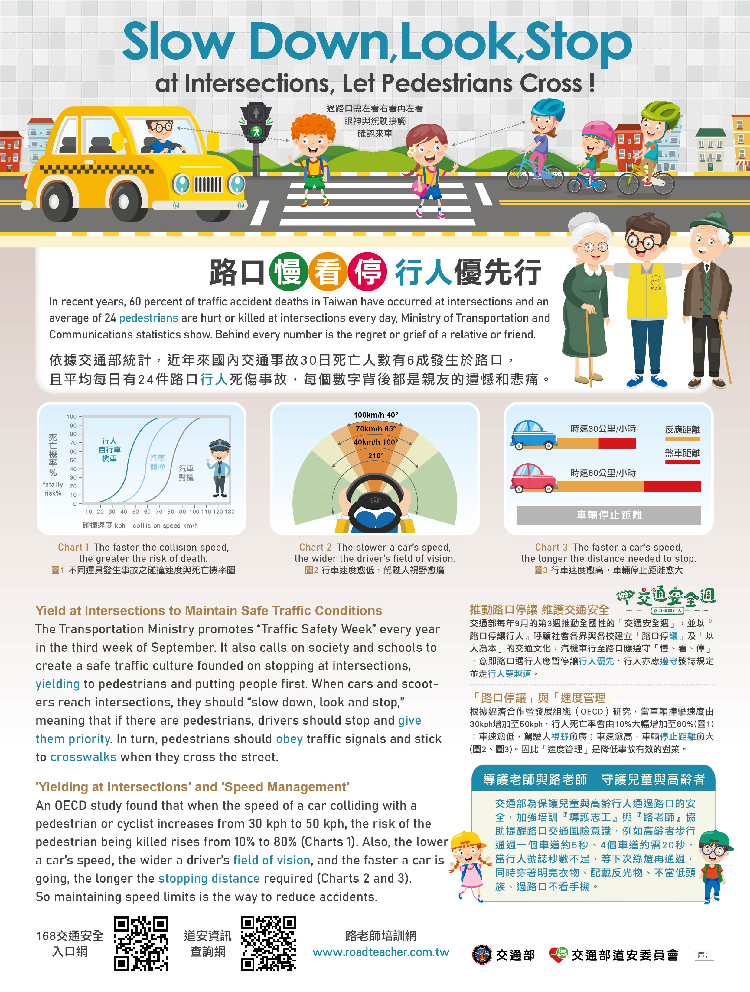 一、依據交通部109年11月18日交安字第1095014923號函辦理。 二、旨揭交通安全輔助教材,刊載於109年12月之「大家說英語」雜誌,請本校同仁於相關課程或跨領域課程教學運用,加強落實「路口慢看停行人優先行」的觀念。
