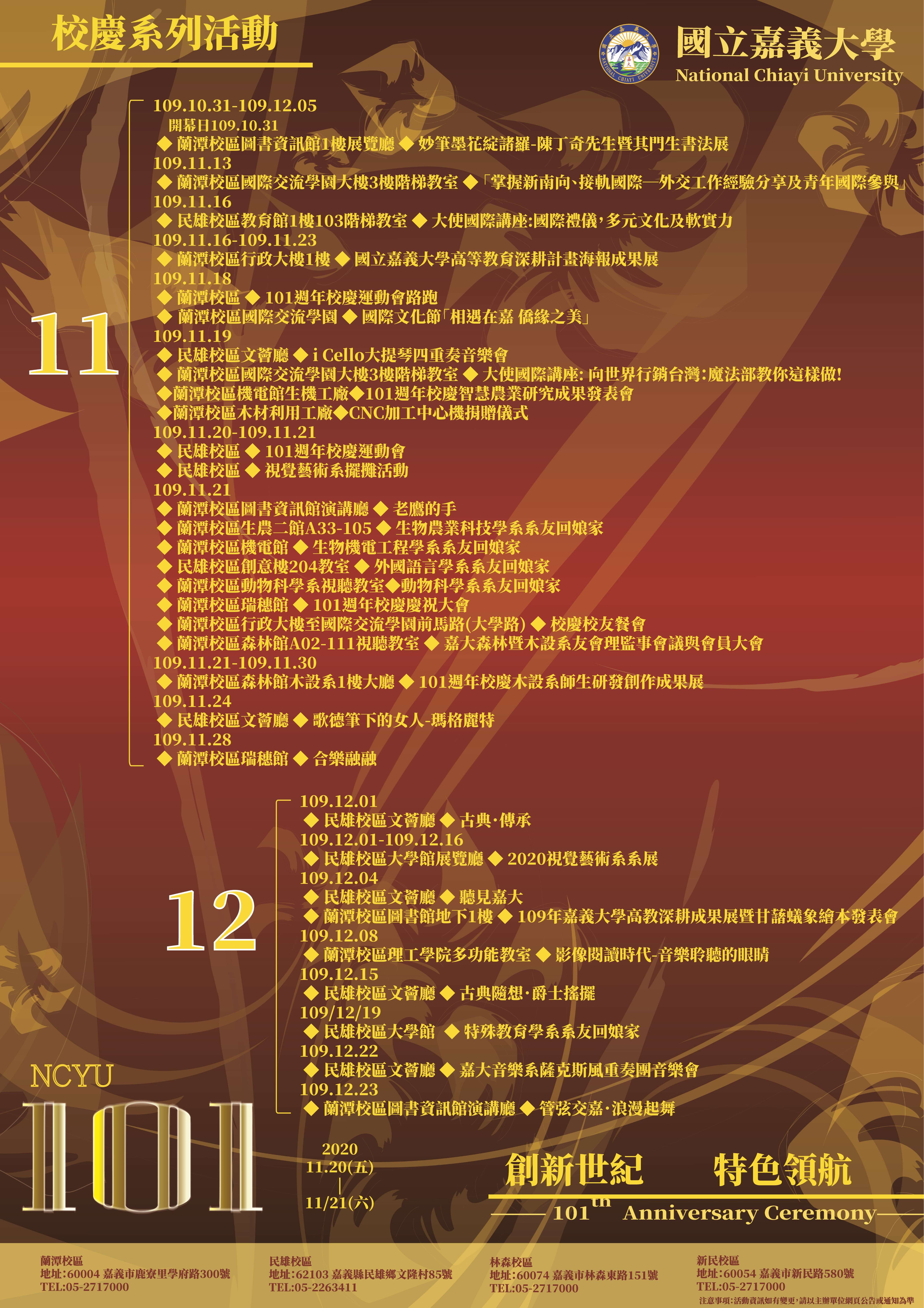 01週年校慶典禮慶祝活動訂於109年11月21日(星期六)在蘭潭校區瑞穗館舉辦。