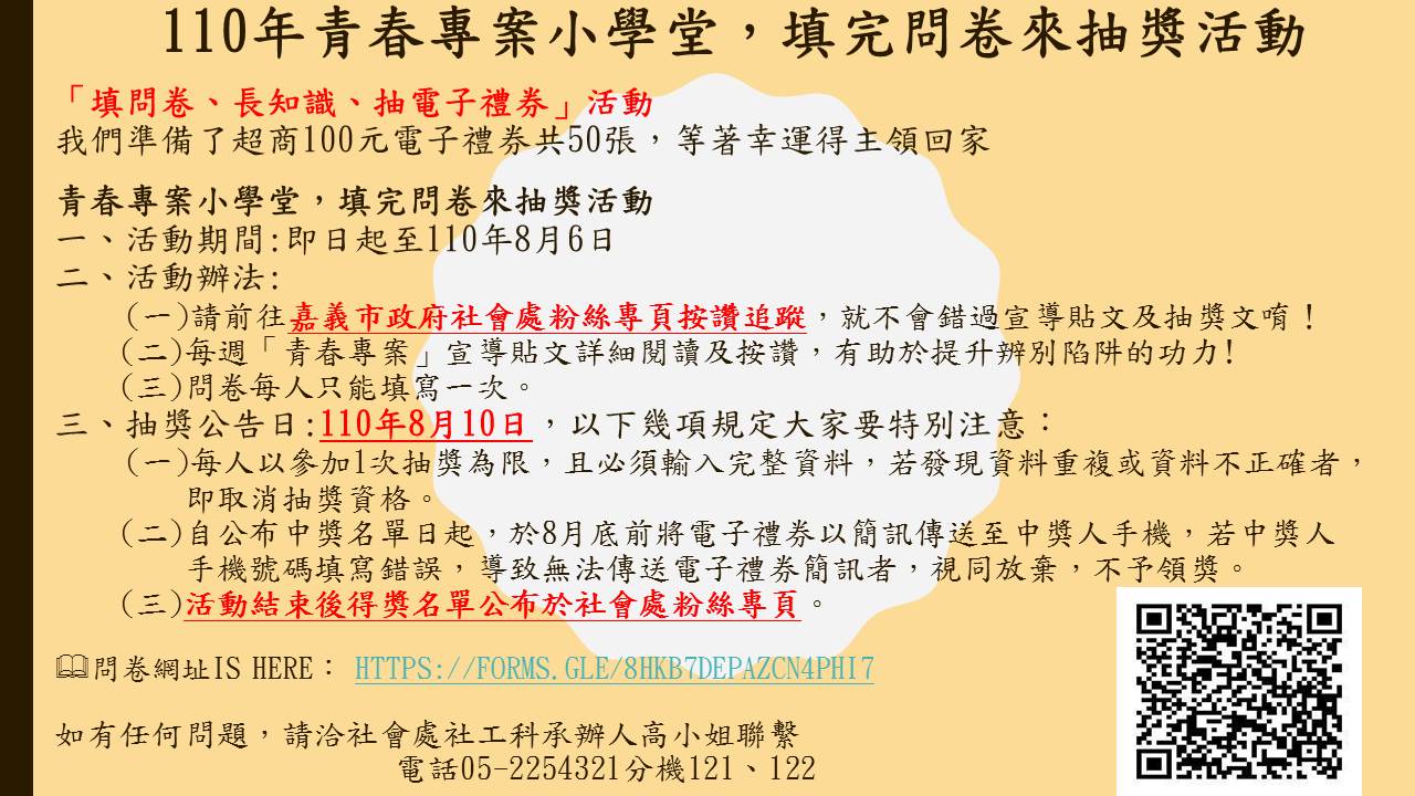 青春專案小學堂,填完問卷來抽獎活動期間自即日起至110年8月6日,欲瞭解更多關於青春專案宣導資源,請追蹤本府社會處粉絲專頁,7-8月每週將有相關貼文宣導。