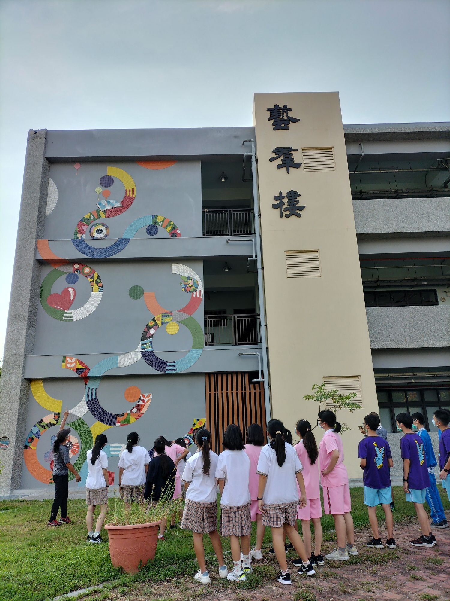嘉義市北園國中繼雙圓樓啟用後,專科大樓「藝羣樓」亦於今(110)年5月驗收完成,整合生科、綜合及藝術領域等學科教室,優化多元學習環境,其公共藝術作品「攜手同心創未來」,以大幅馬賽克拼貼,明亮活潑的色彩與構圖,妝點校園,更寓意以師生攜手追逐夢想,極富巧思。