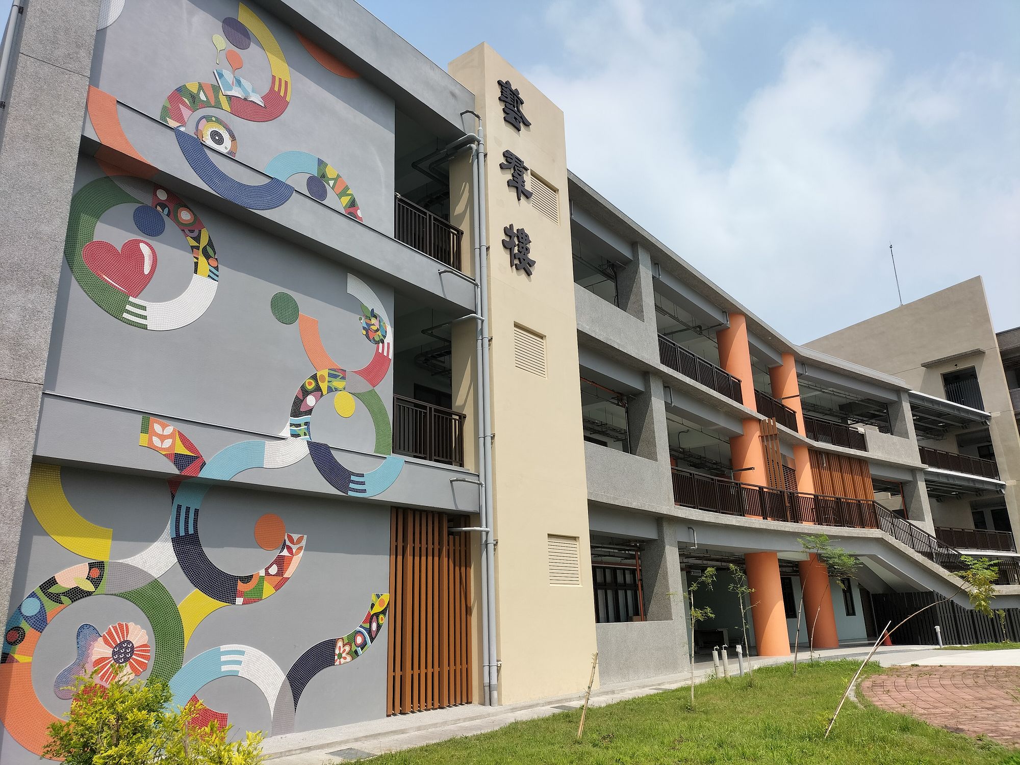公共藝術作品「攜手同心創未來」,為瓷質馬賽克作品,設置於專科大樓「藝羣樓」東向牆面,高10餘公尺縱向延伸一到三樓,由藝術家謝明憲創作,創作理念呼應學校品德、閱讀、文化之辦學願景,傳達心中有愛、健康成長、快樂學習的教育態度,記錄在時間流轉下,師生攜手同心,由愛出發,共創智慧創意,學子勇於追逐夢想,飛向未來。圖像以具象與半抽象方式呈現,細看可發現書本、氣球、愛心、管樂及花卉等圖形,凸顯教育意義及在地特色,園中發展強項排球運動也融入其中;整體觀之,大片圓弧線條代表師生攜手及時間流轉更迭,學子累積智識、開拓眼界,進而勇敢追夢。