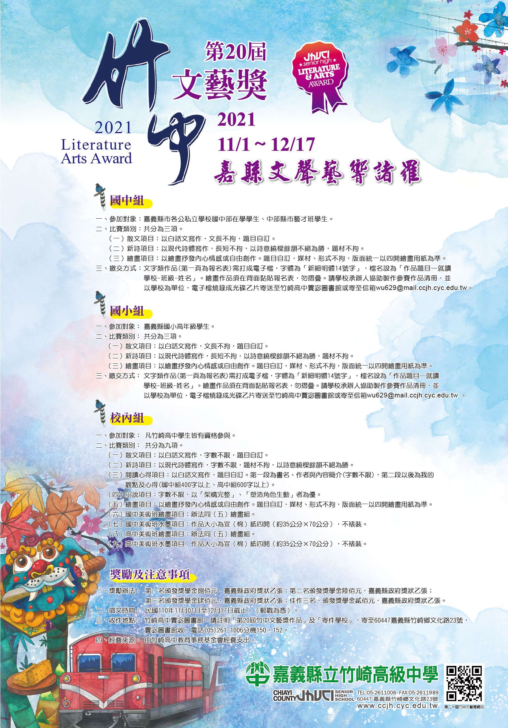 五、第二十屆竹中文藝獎實施辦法請見附件,書面海報另以郵寄送達。