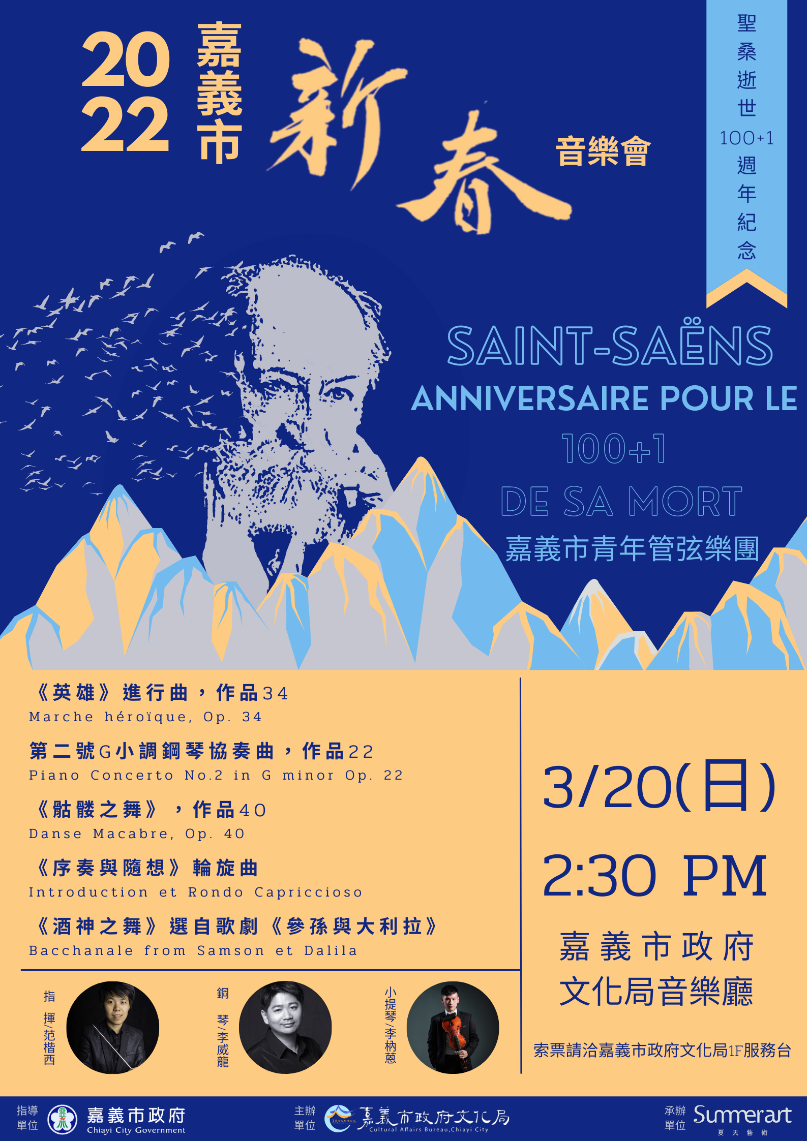 一、旨揭音樂會於嘉義市政府文化局音樂廳111年3月20日(六)14:30演出。 二、索票訊息:111年2月26日起於嘉義市政府文化局(1樓服務台)免費索取。