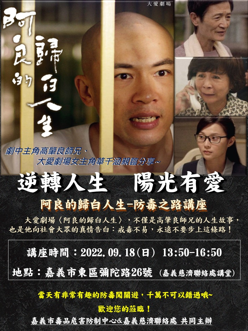 一、為喚起市民對毒品危害重視,本局訂於111年9月18日假嘉義慈濟聯絡處講堂辦理「『逆轉人生 陽光有愛』阿良的歸白人生-防毒之路活動」,請轉知所屬踴躍參加。