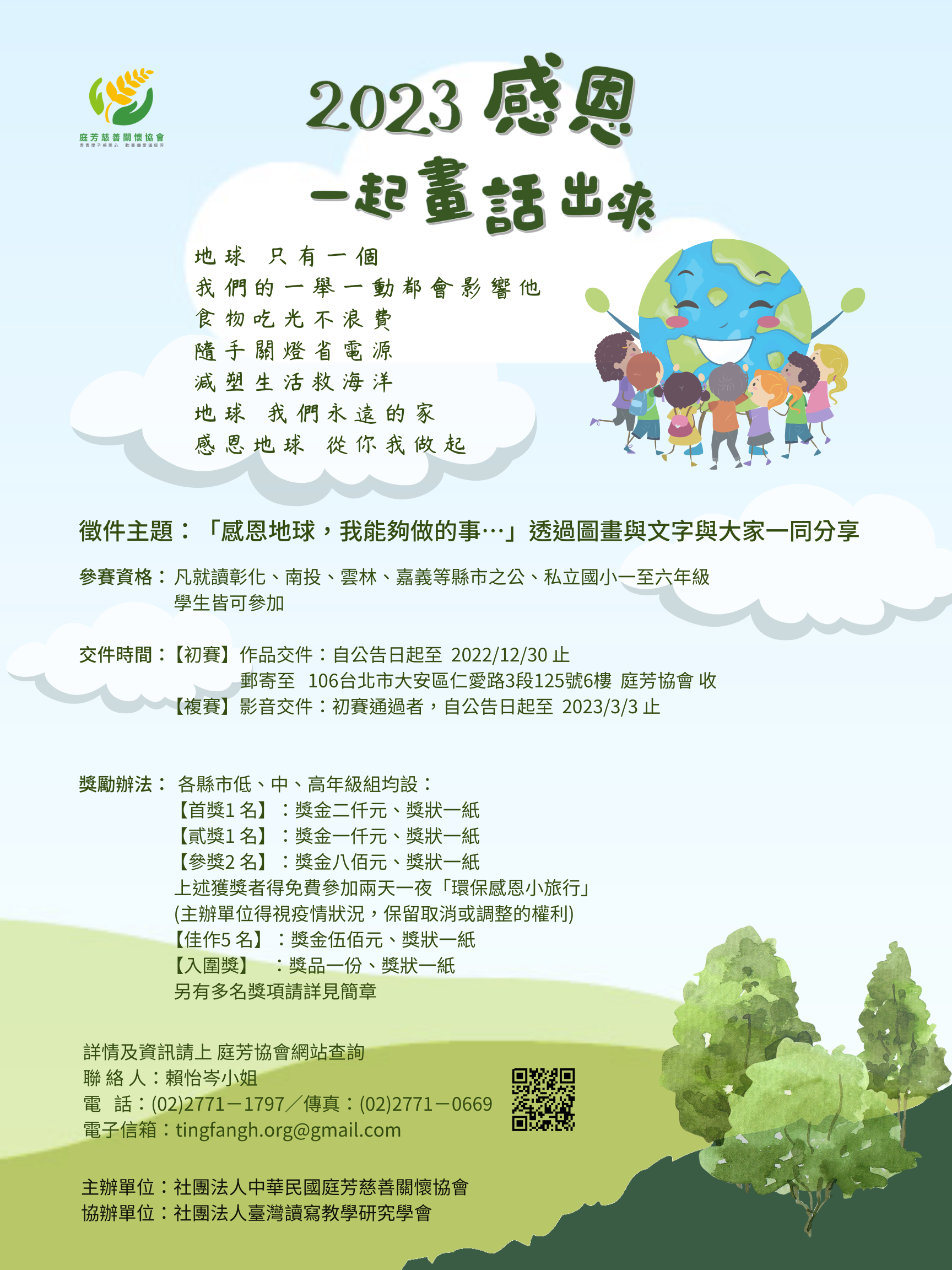 二、旨揭活動為深化品格教育學習並鼓勵圖文創作,提供獎狀、獎金或獎品激勵參賽並增進學習視野,活動詳細訊息請參閱該會官網(網址:https://tingfang.org.tw/content/one/875)。