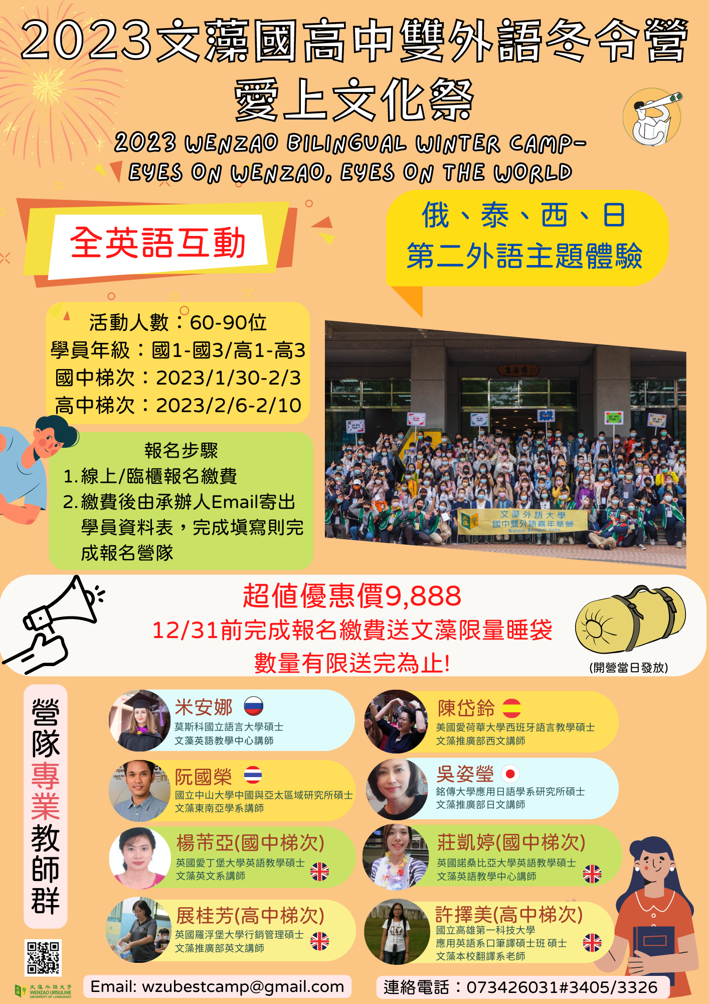 三、活動對象:國中學生(採全英語教學與活動進行,報名時請