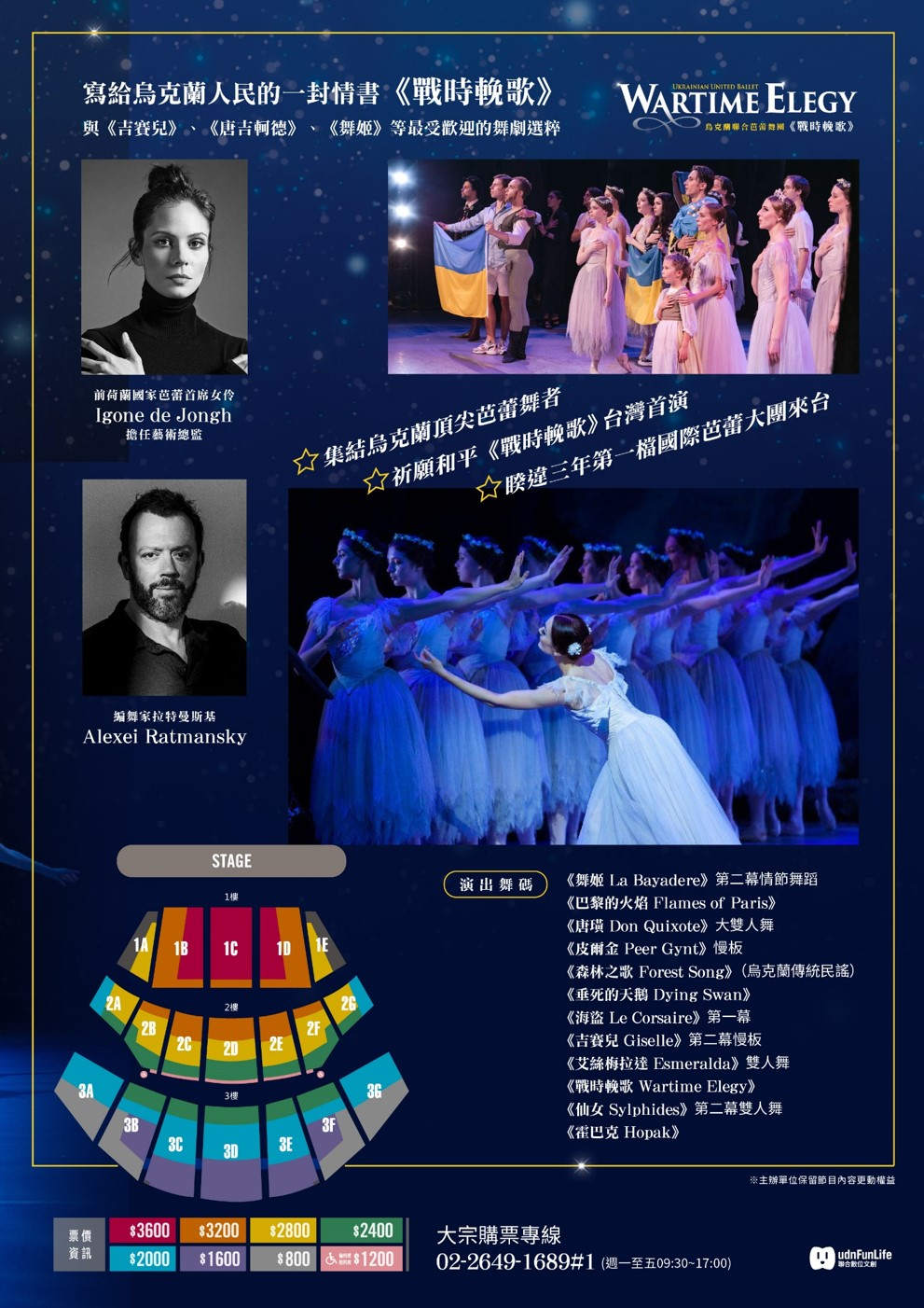 (三)表演介紹:烏克蘭聯合芭蕾舞團(United Ukrainian Ballet)集結一群烏克蘭頂尖芭蕾舞者,他們來自於烏克蘭各地劇院與舞團,因烏俄戰爭而流離失所,最後落腳荷蘭海牙,在此重拾舞鞋,恢復日常的訓練,組成一支職業舞團,在此作為烏克蘭芭蕾舞者的戰時庇護所。2022年烏克蘭聯合芭蕾舞團陸續巡演英國、澳洲、新加坡、美國等地,所到之處票券銷售一空,感動無數觀眾,讓世人見證藝術撫慰人心的神奇力量。本次舞團將帶來《戰時輓歌》、《吉賽兒》、《唐吉軻德》、《舞姬》等最受歡迎的舞劇選粹。《戰時輓歌Wartime Elegy》是當代最重要的編舞家之一拉特曼斯基(Alexei Ratmansky)在烏俄戰爭爆發後的全新創作,但並未充滿政治訊息,相反地,他採用了烏克蘭當代最知名作曲家西爾維斯特洛夫(Valentin Silvestrov)的音樂,加上烏克蘭傳統歌曲,是拉特曼斯基寫給烏克蘭人民的一封情書,向他們堅韌不拔的精神致敬,並祈禱未來的和平。其他精采節目包括《舞姬La Bayadere》充滿動感與異國風情的第二幕;以雙手關節展現不可思議靈活度與生命力的《垂死的天鵝The Dying Swan》;挑戰男女舞者技巧極限的《海盜 Le Corsaire》第一幕;以及《唐吉軻德Don Quixote》的大雙人舞等,其32鞭轉的難度完全不遜於黑天鵝在《天鵝湖》的高潮。此外,舞團更特邀世界其他頂尖舞團的烏克蘭舞星,包括前馬林斯基首席Anastasia Matvienko與Denis Matvienko,以及英國國家芭蕾的Katya Khaniukova等人加入客席陣容,為台灣民眾帶來一場最精采的芭蕾盛宴,希望以藝術感動人心,為這個紛擾的世界帶來光明與希望。