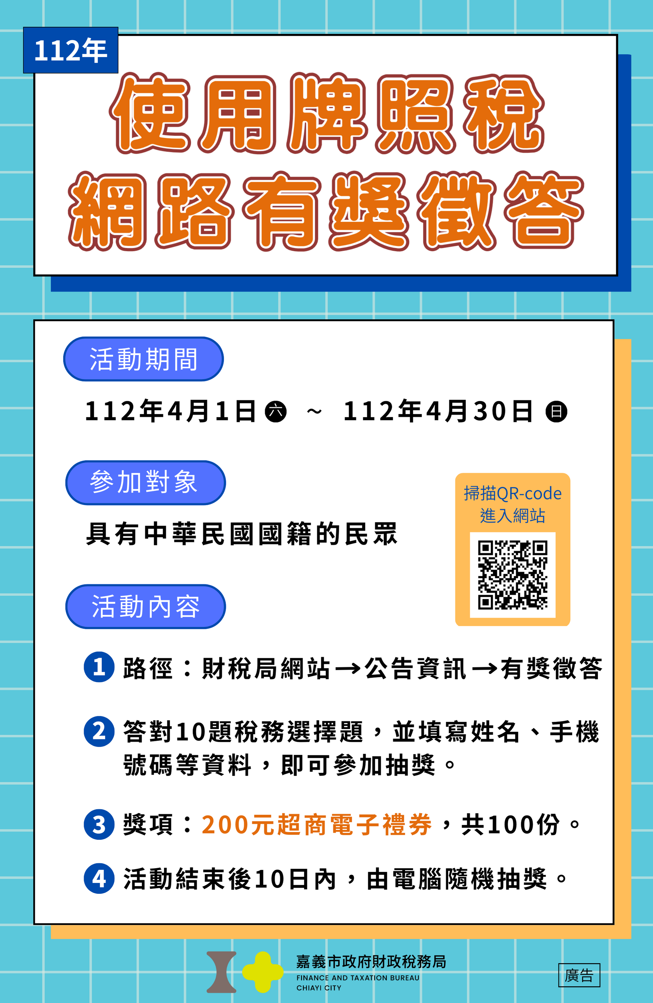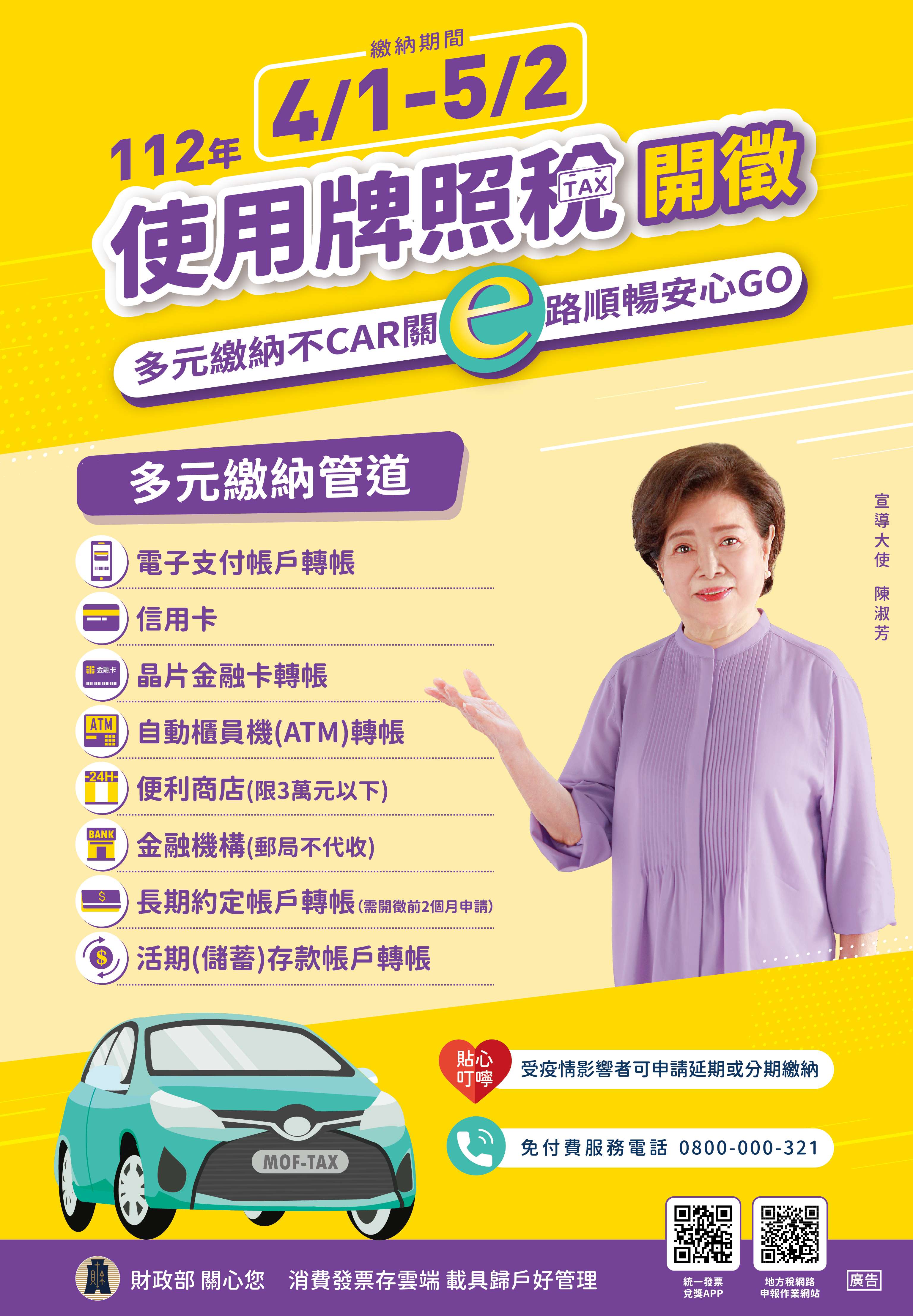 (一)112年使用牌照稅於4月1日開徵,繳納期限至4月30日止。