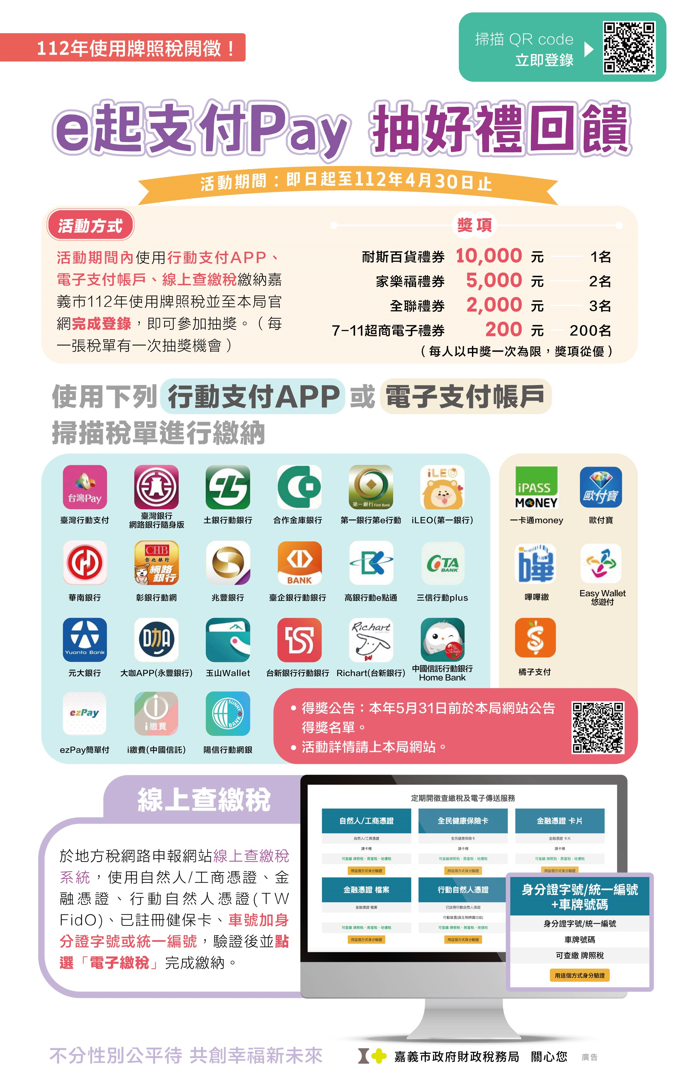 (二)「e起支付Pay抽好禮回饋」,4月30日前以行動支付APP、電子支付帳戶或線上查繳稅繳納使用牌照稅並至市府財稅局網站完成登錄,即可參加抽獎。