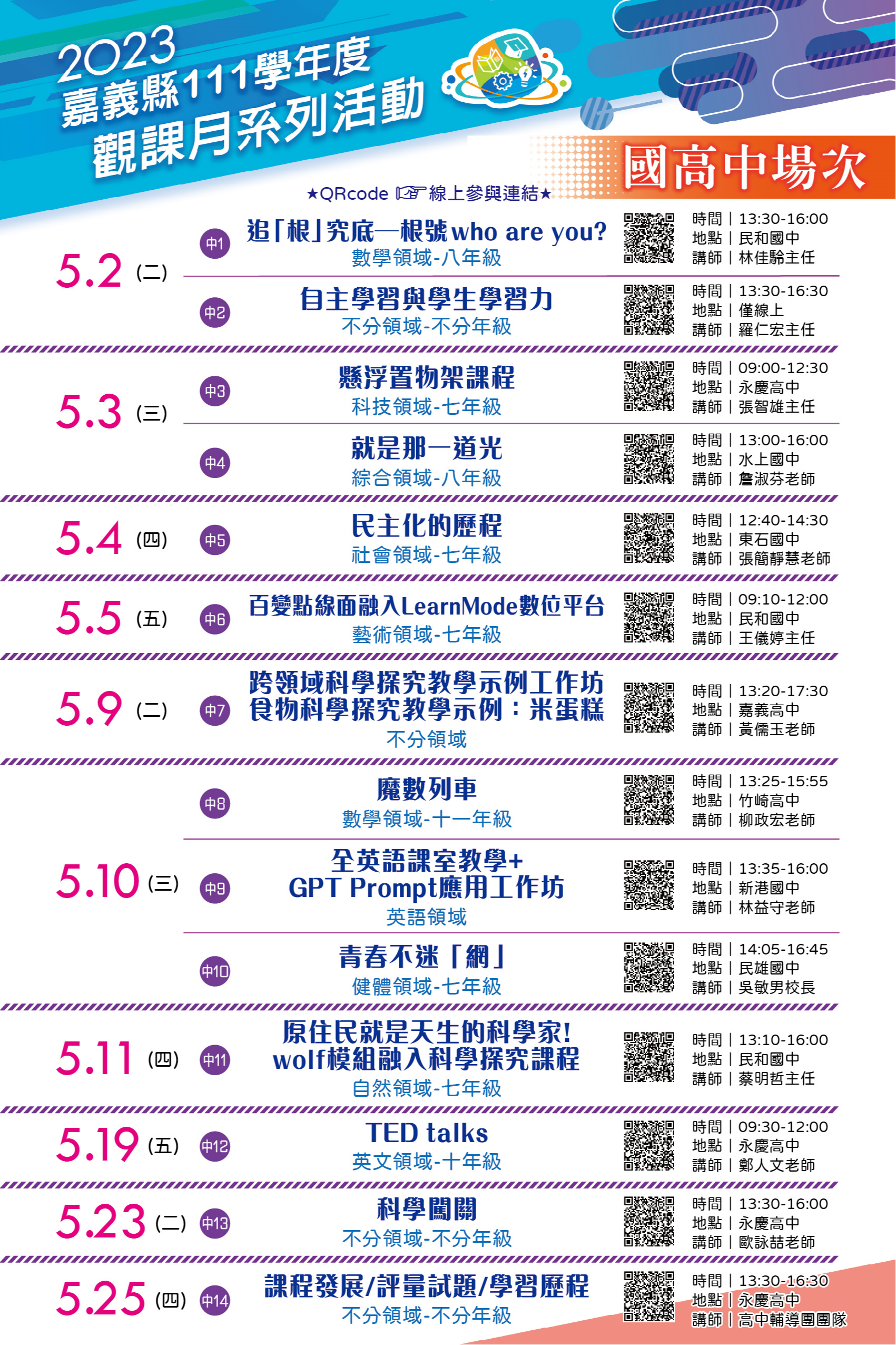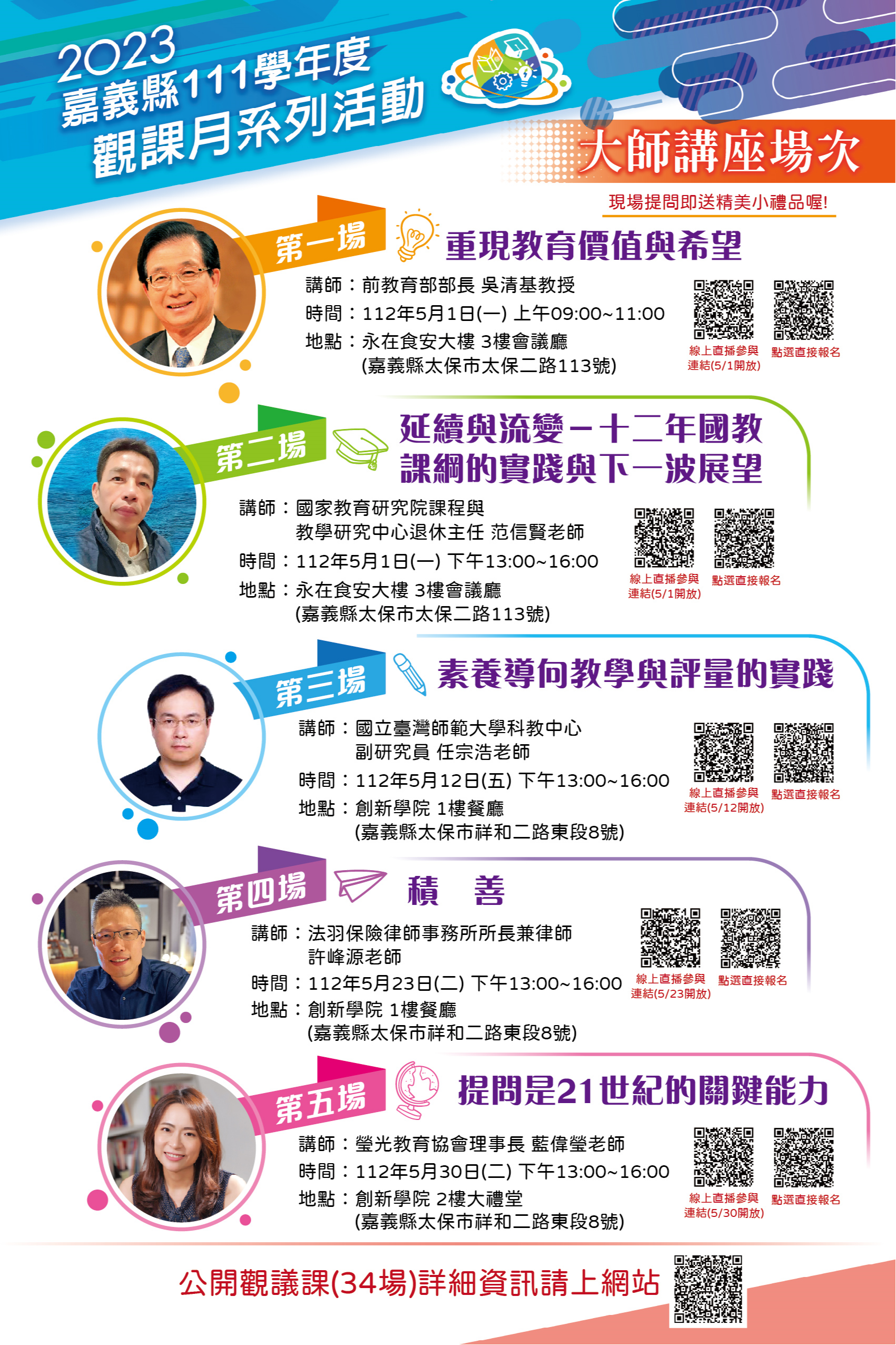 1、大師講座共計5場次,邀請吳清基前教育部部長、國家