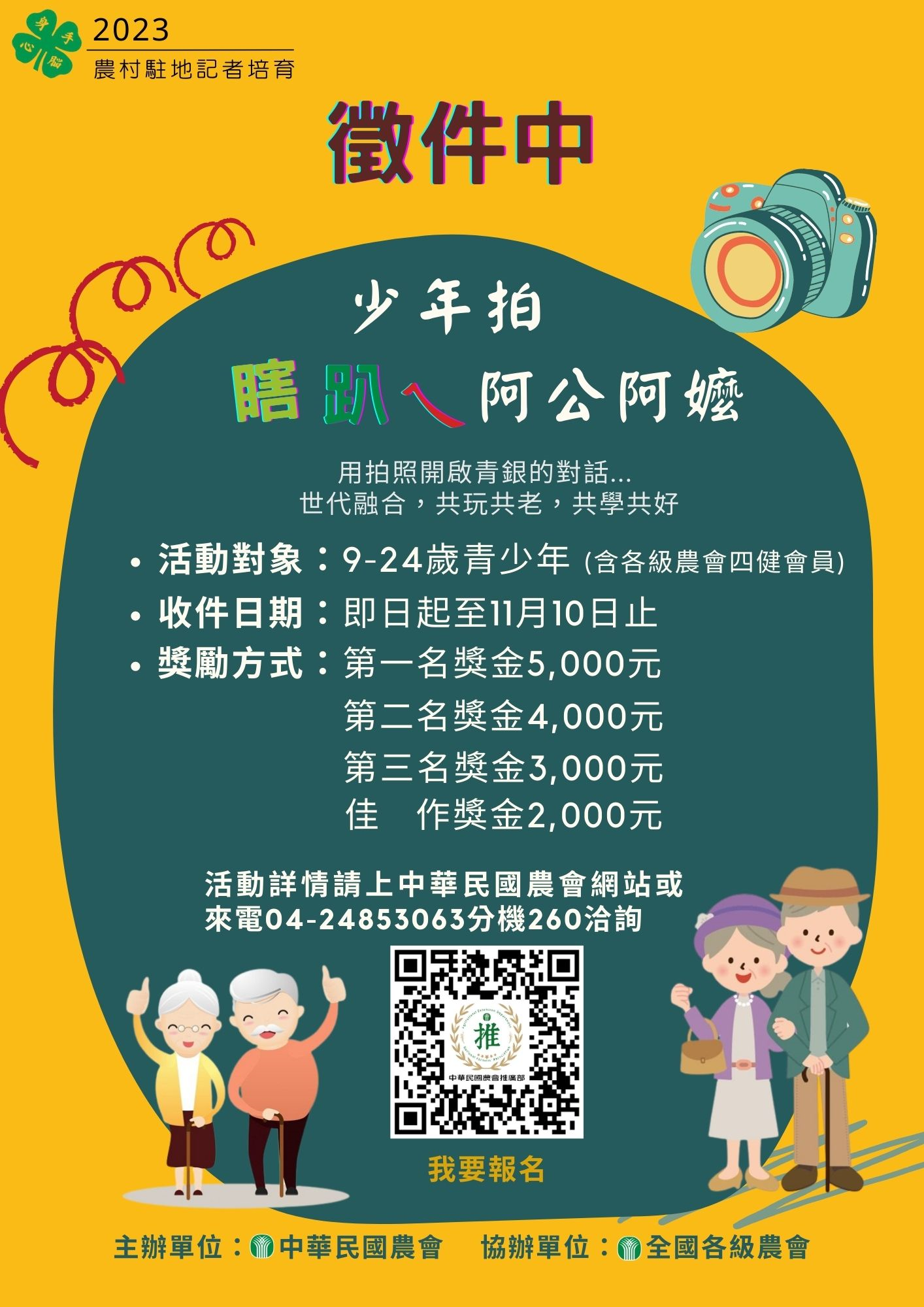 二、活動目的:為增進青銀溝通拉近世代距離,特以「少年拍,瞎趴ㄟ阿公阿嬤」為主題,鼓勵青少年透過拍照開啟青銀的對話,佐以文字傳遞世代的交流,愛老慈幼,一起共學共伴、共老共好。
