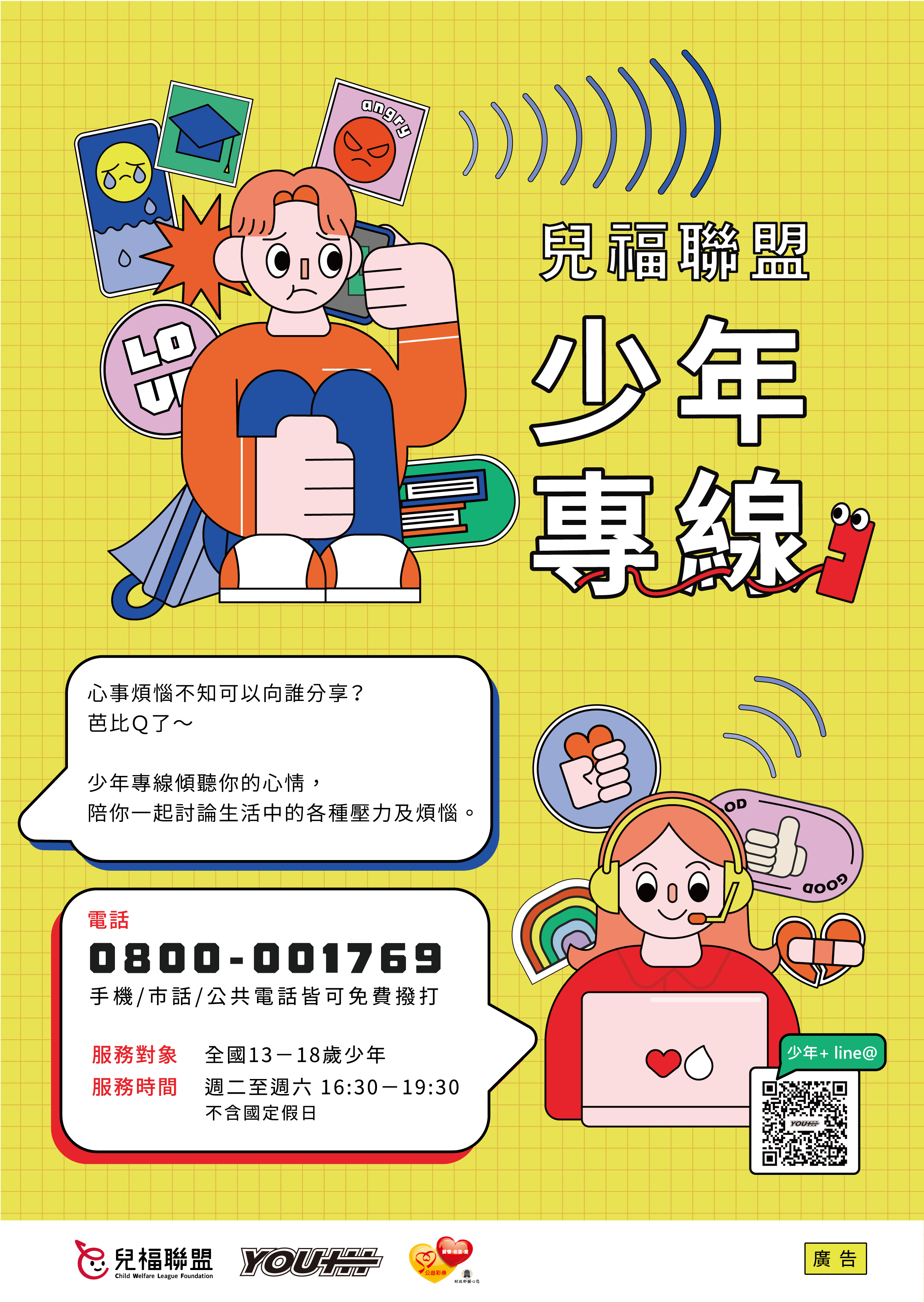 提供全台12歲至18歲之少年免付費電話諮詢服務,服務時