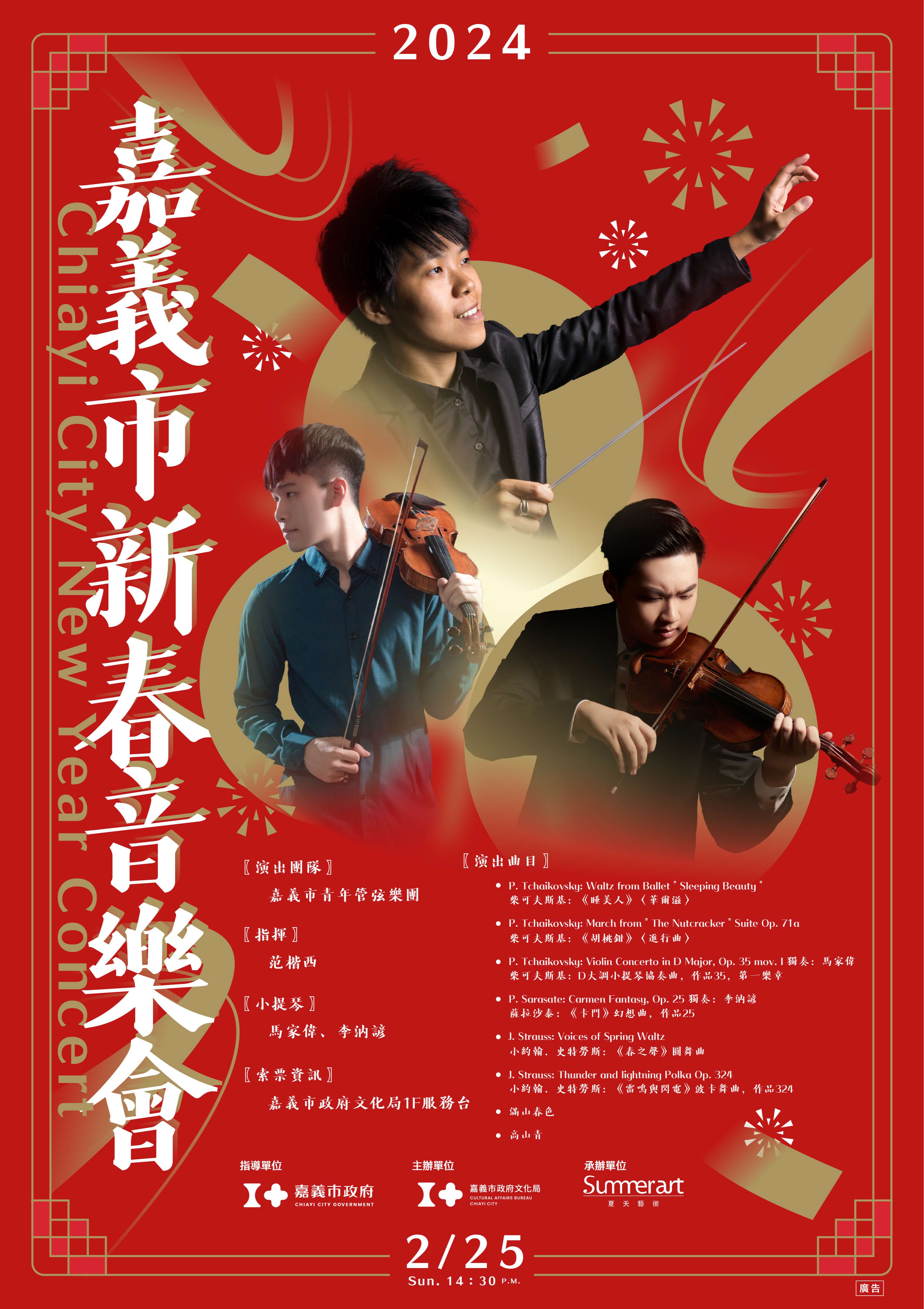 一、「2023嘉義市青年管弦樂團」將以音樂祝福嘉義市民2024新春快樂!樂團將奏響睡美人選曲、春之圓舞曲、雷鳴與閃電波卡、滿山春色、高山青等活潑歡快、清新悅耳的旋律,也將偕同菁英團員演出協奏曲,展現在地青年充沛的音樂能量,誠摯邀請貴校師生一同沉浸在嘉義在地青年學子的樂聲中,迎接嶄新的一年。