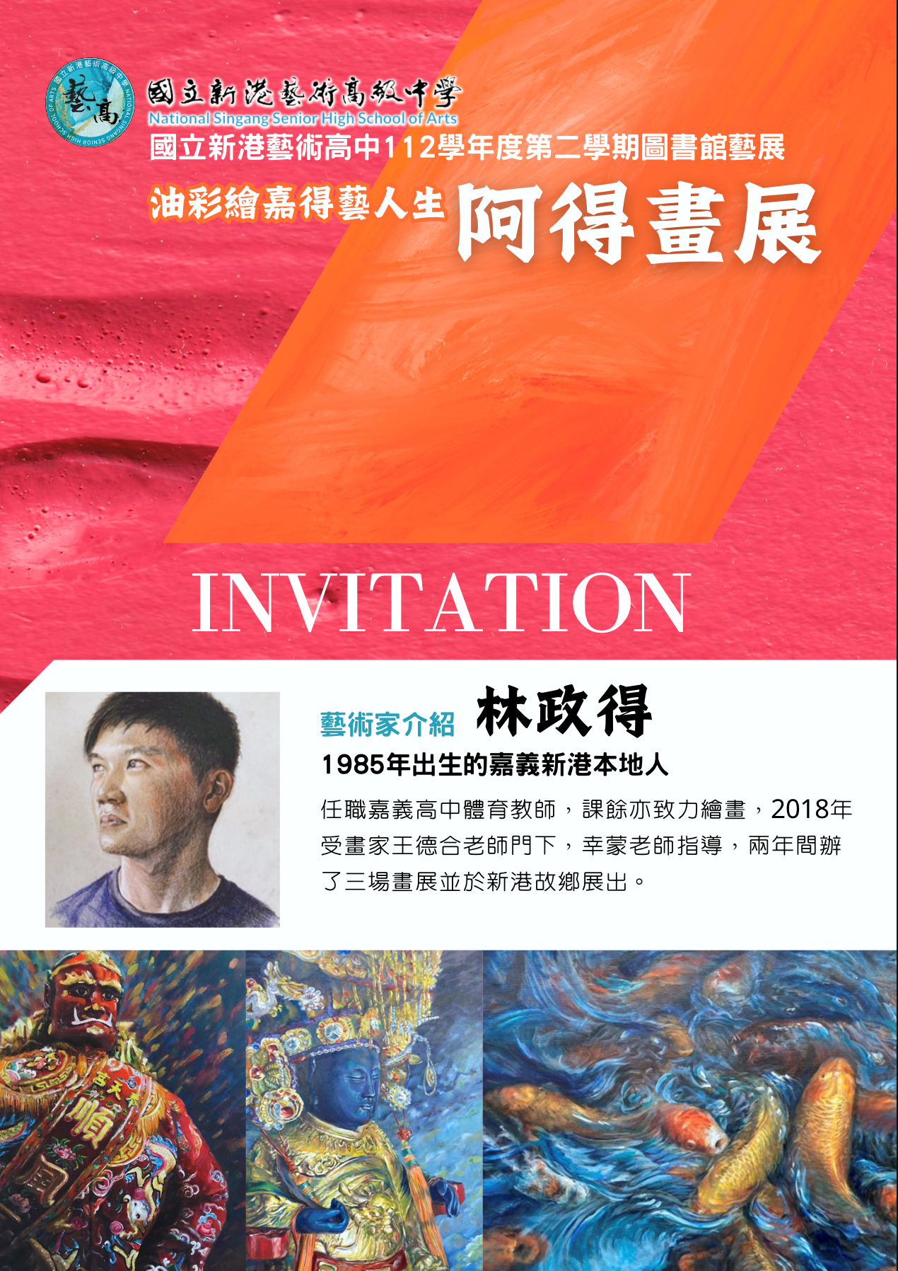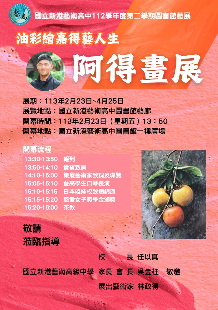 一、「油彩繪嘉得藝人生─阿得畫展」展期為113年2月23日(星期五)至4月25日(星期四)。