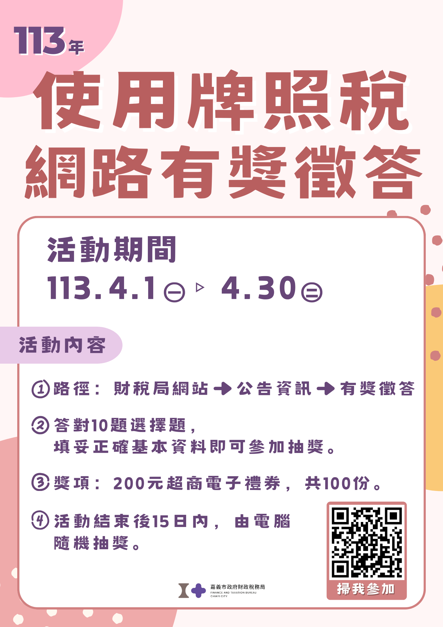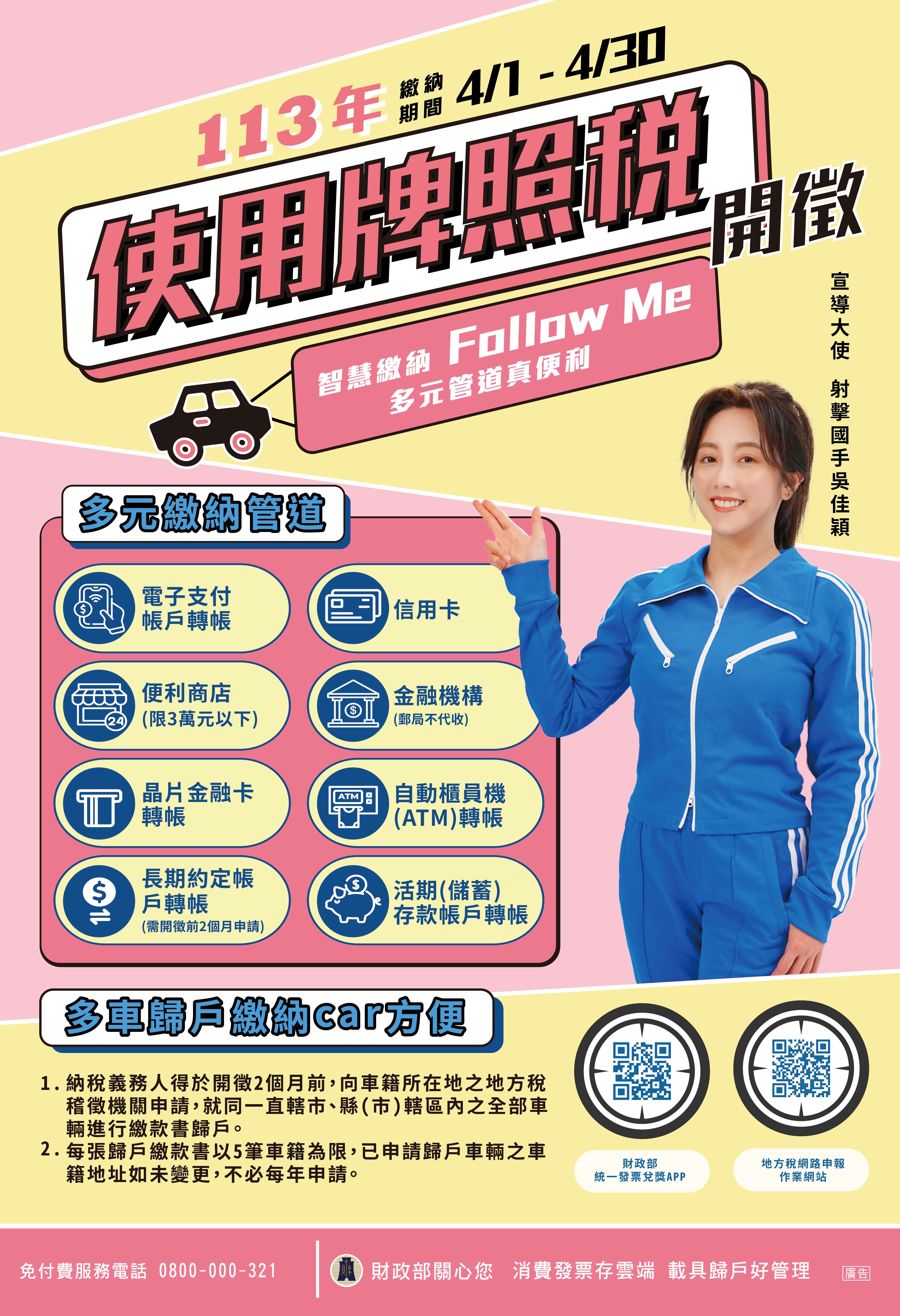 (一)113年使用牌照稅於4月1日開徵,繳納期限至4月30日止。