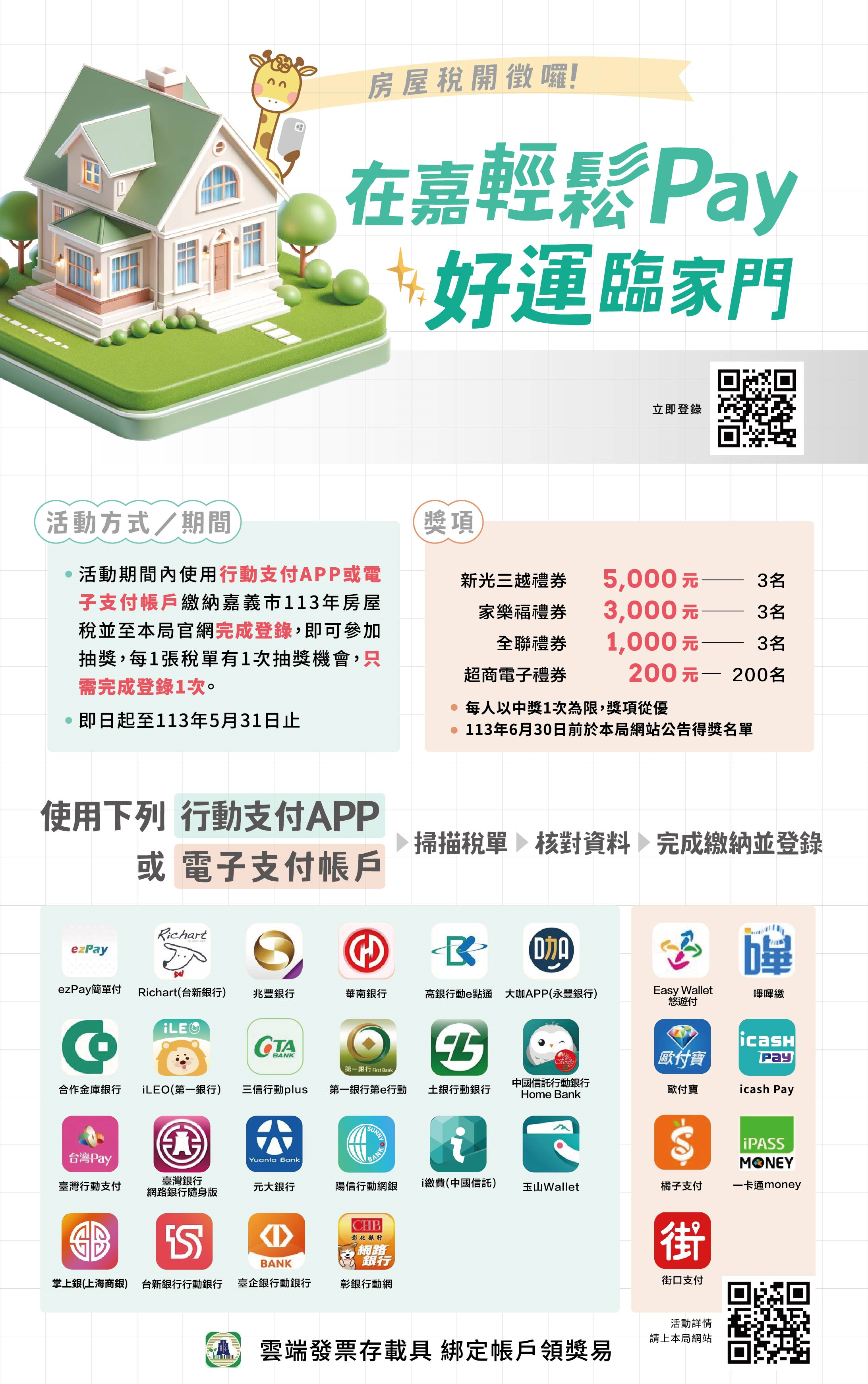 (三)「在嘉輕鬆Pay 好運臨家門」,5月31日前以行動支付或電子支付繳納本市開徵房屋稅並至市府財稅局網站完成登錄即可參加抽獎。