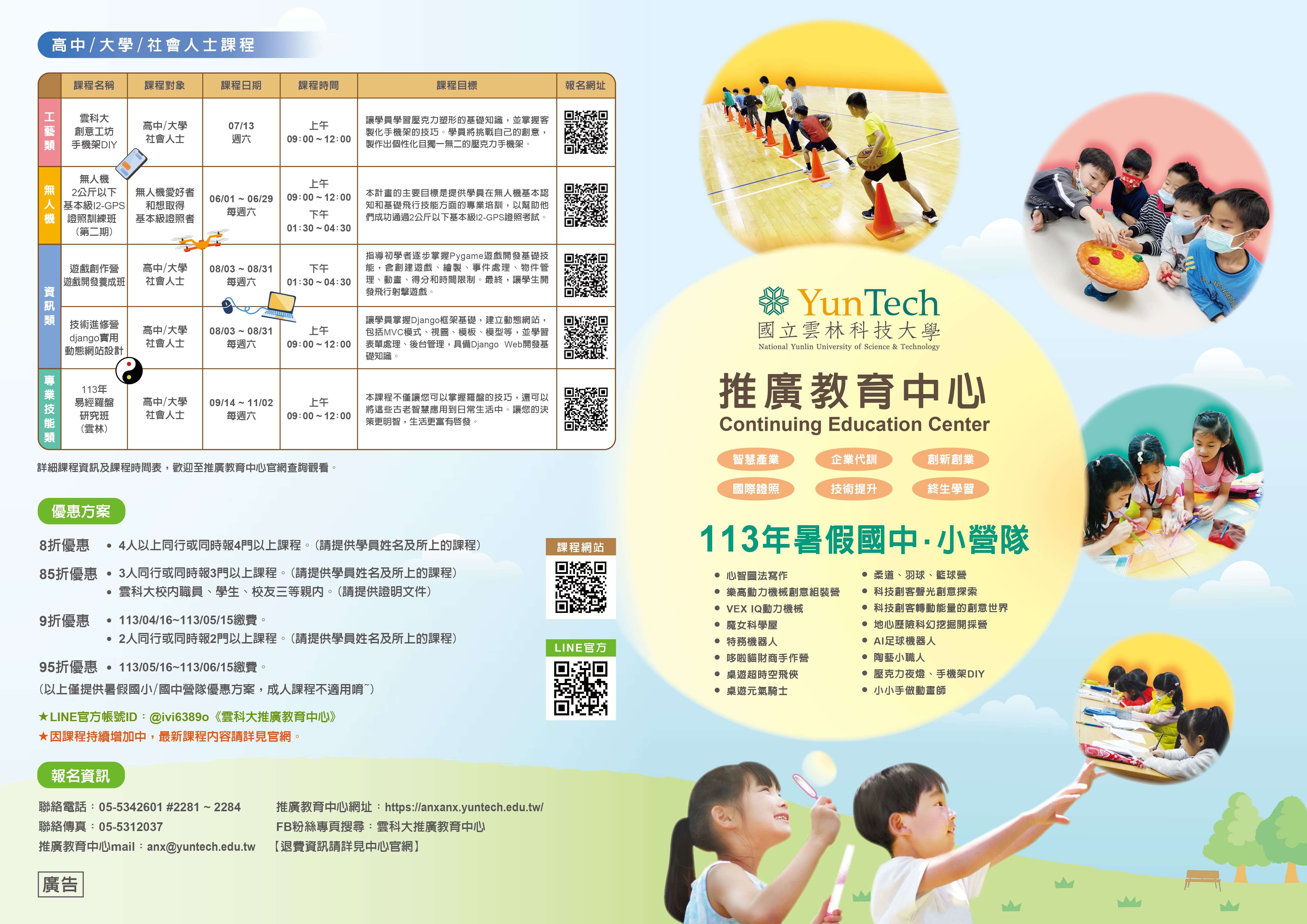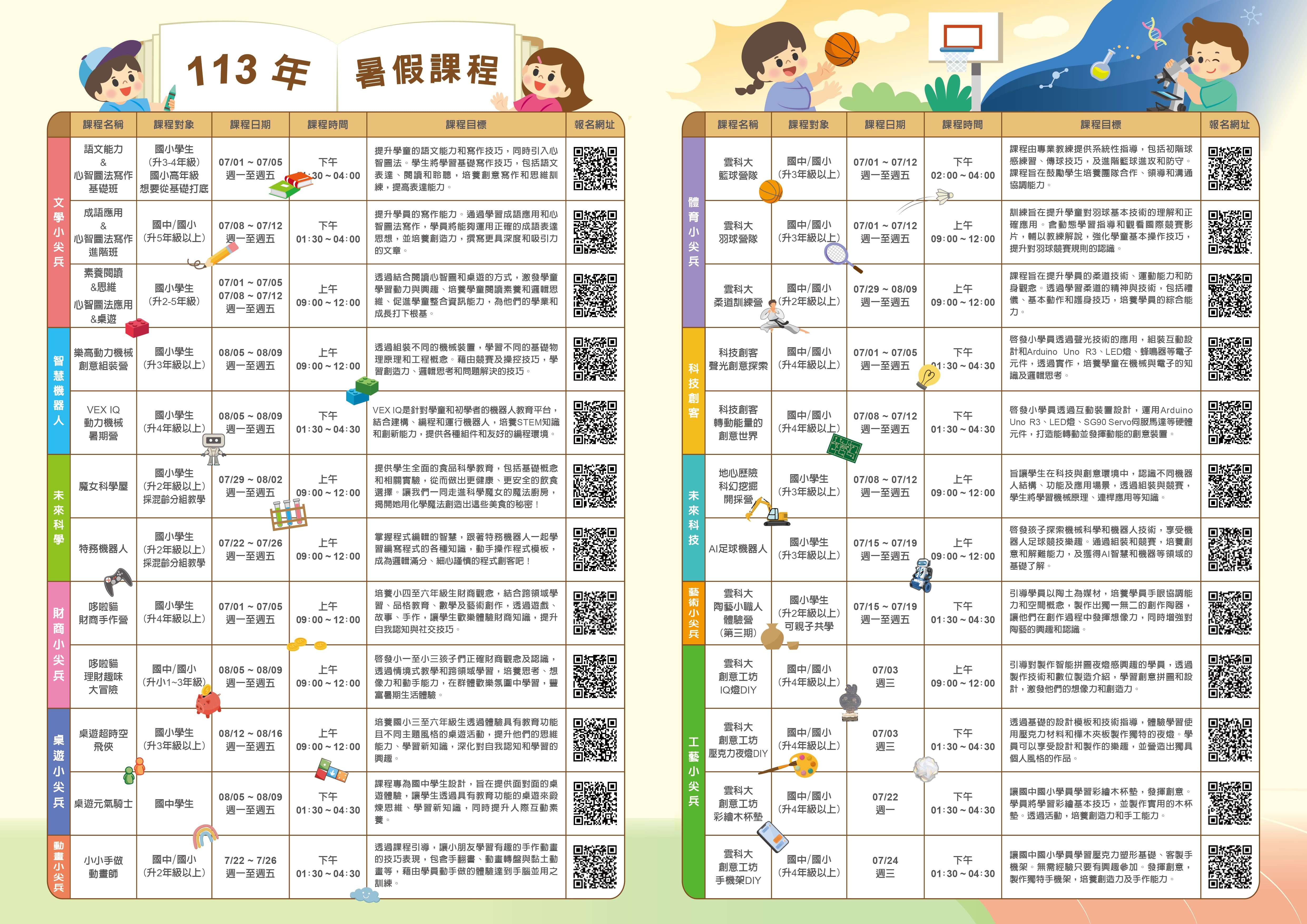 一、本校推廣教育中心將於2024年7月至8月暑假期間舉辦青少年及兒童知能培訓營。課程涵蓋體育、藝術、財商、科技創客、未來科學、智慧機械、寫作能力培養及工藝創作等多項類別。透過多樣化的學習途徑,讓學生在暑假期間拓展視野、發掘興趣,並培養自主學習的能力與習慣。