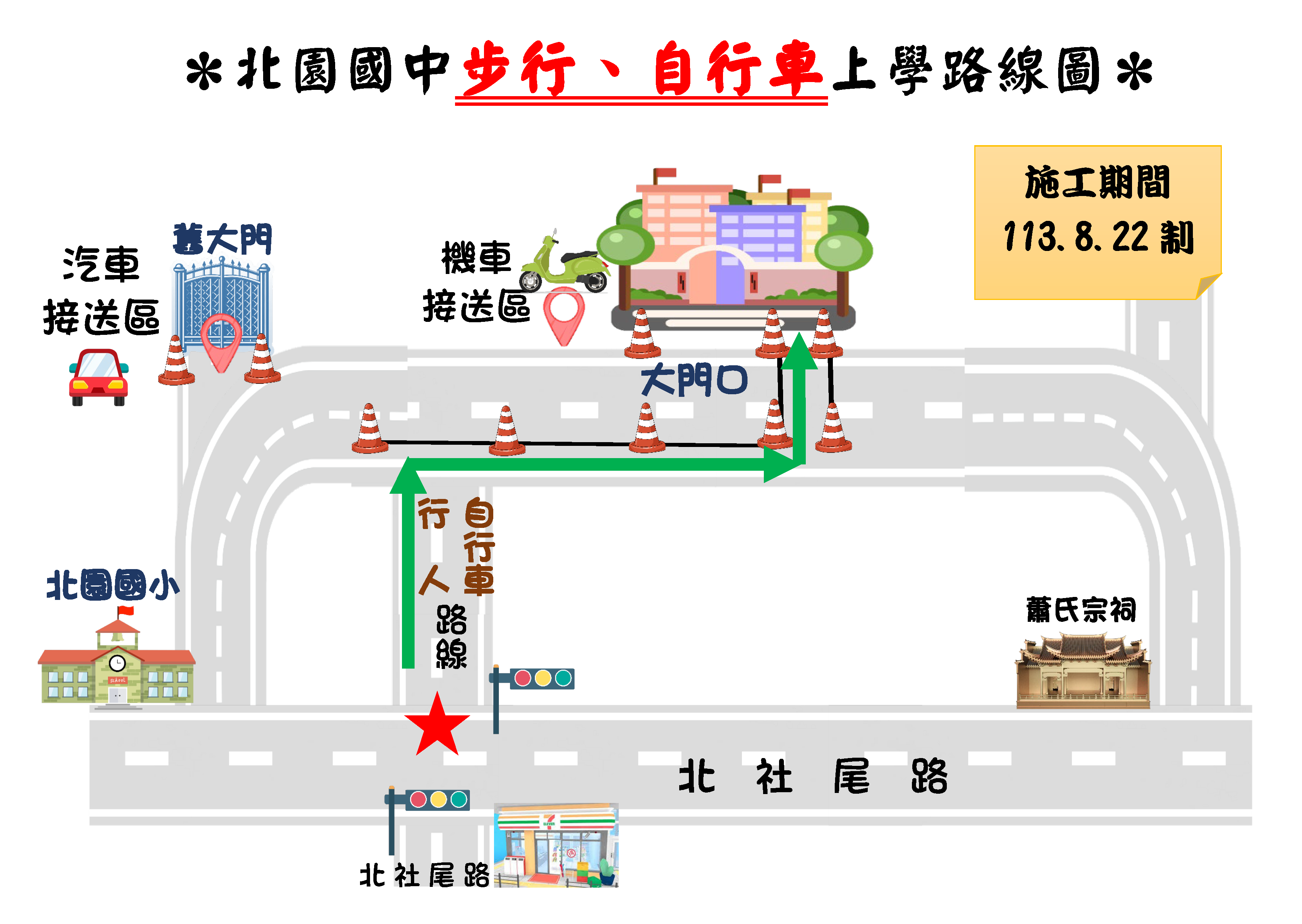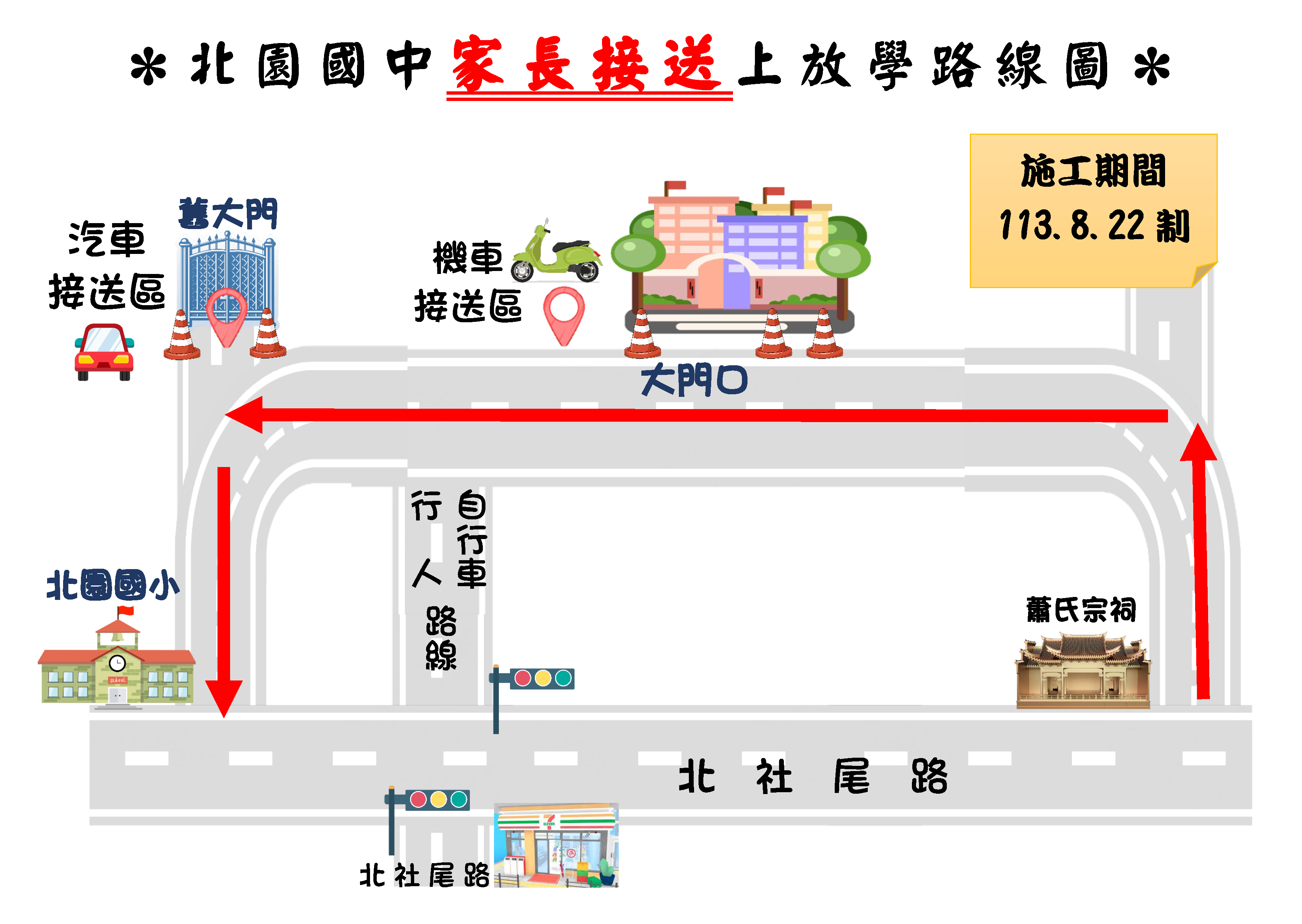2.請家長盡量讓學生在北社尾路便利商店下車步行至學校。