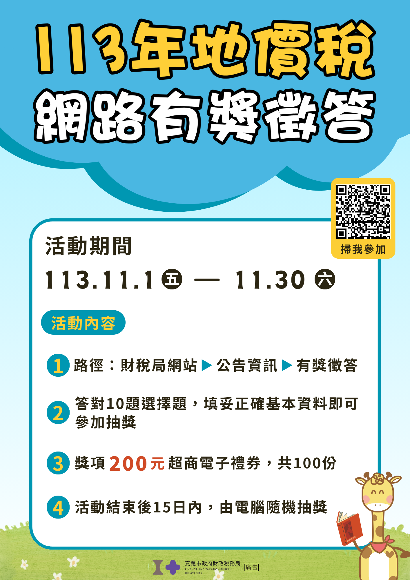 電子支付繳納本市開徵地價稅並至市府財稅局網站完成登錄即可參加抽獎。