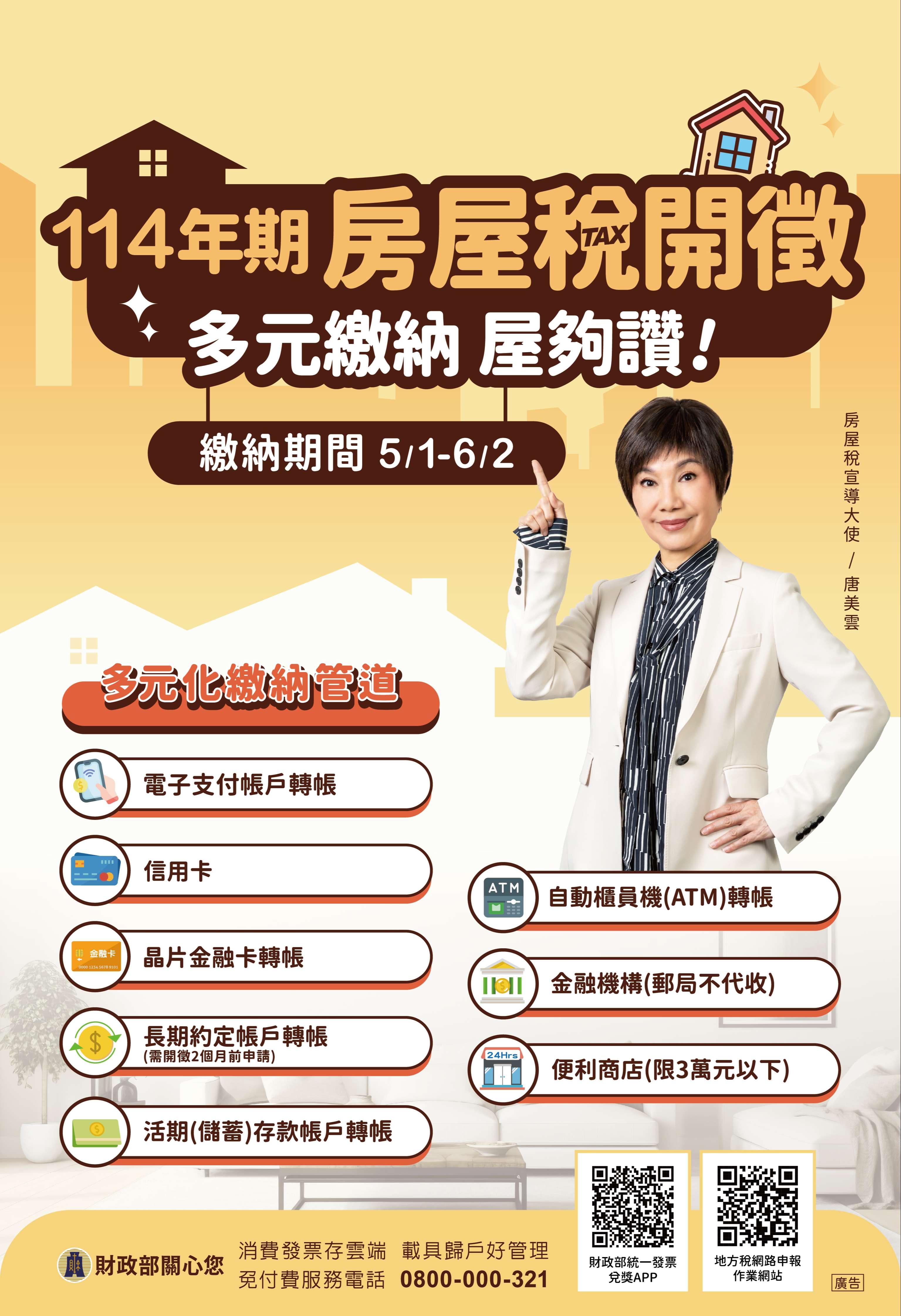(一)114年房屋稅於5月1日開徵,繳納期限至6月2日止。