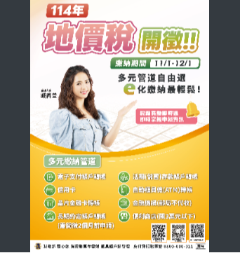 (一)114年地價稅於11月1日開徵,繳納期限至11月30日(適